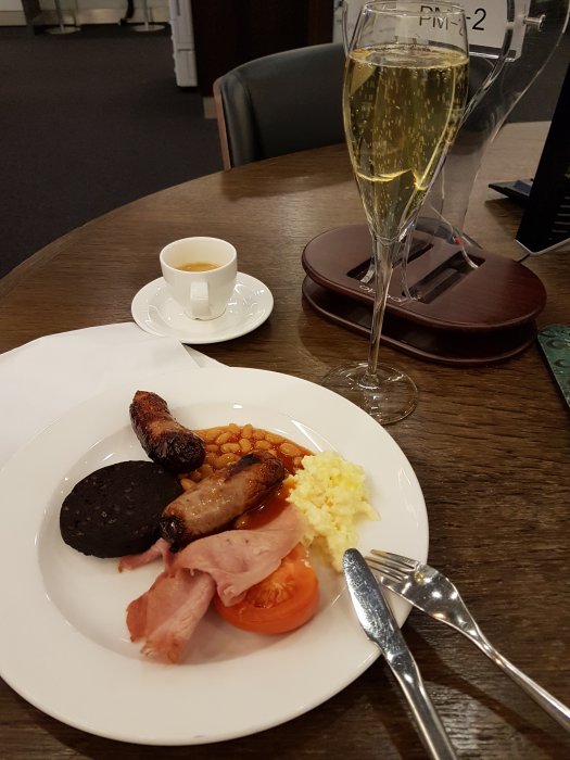 Hej från plaza premium lhr t5, en lounge jag inte visste fanns. Folktomt och helt ok frukost, helt klart ett alternativ till club loungerna och faktist även gf om man har kort om tid och gate på norra sidan. Man kommer in med amex platinum eller så kostar det 40 pund.