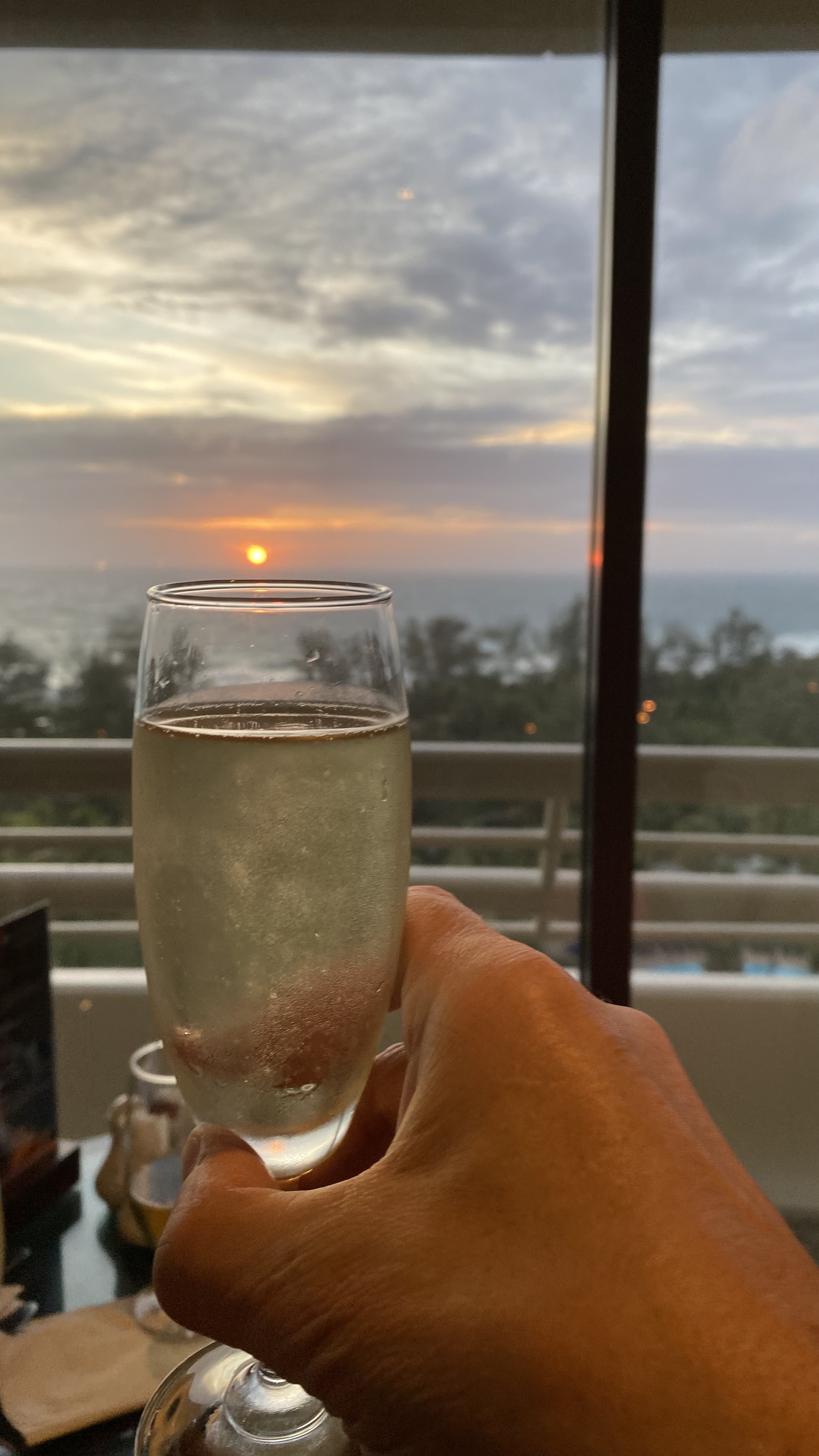 Då kör vi en solnedgång från loungen i Pullman Phuket Arcadia Karon hotell. Vi är själva här och imorgon är stor Budda day i 2 dagar utan alkohol här i Thailand. Så varför är vi ensamma idag?!