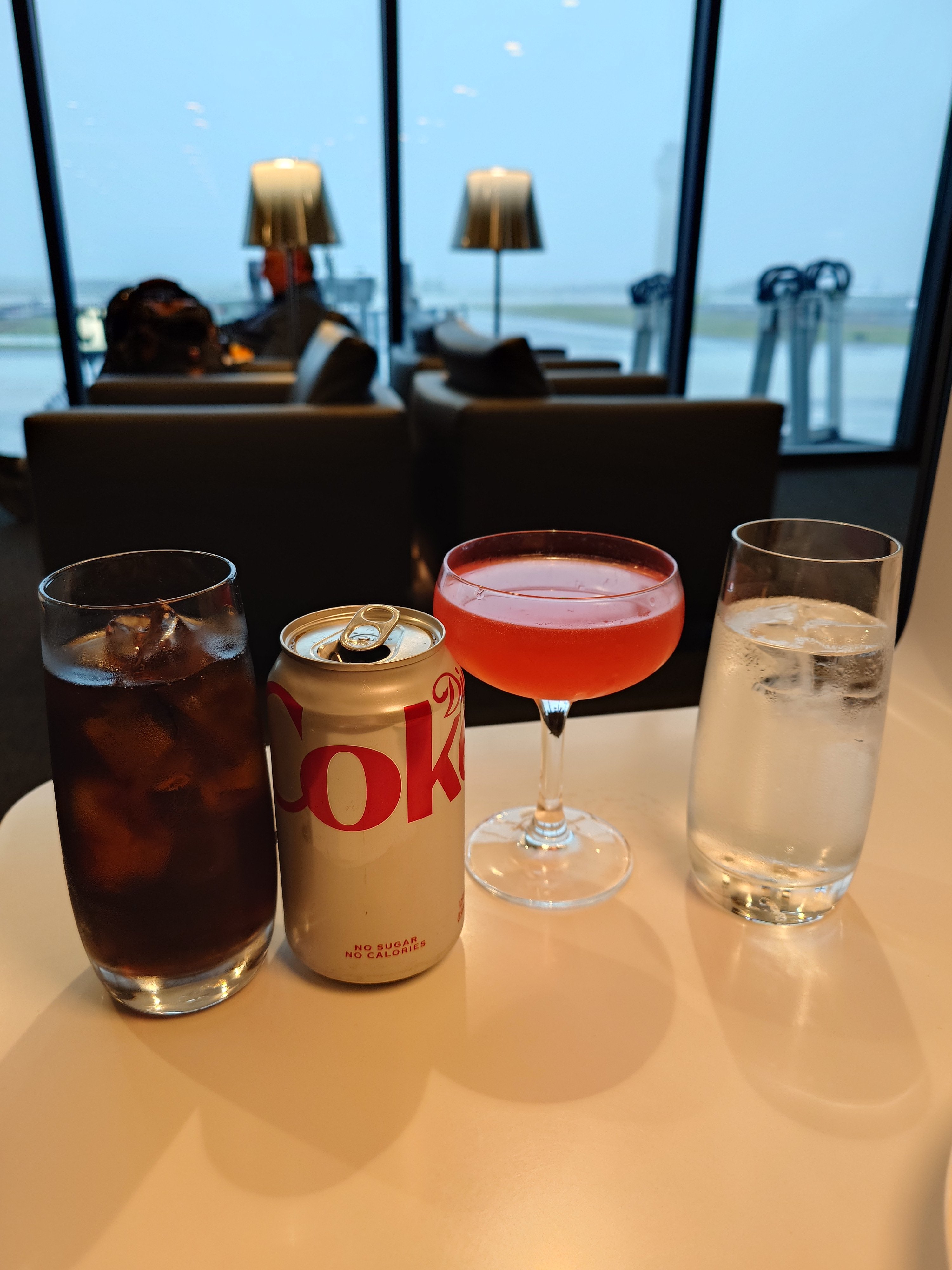 Rätt gott om sittplatser men kanske 75% beläggning nu, lite rörigt då allt ät- och drickbart verkar finnas i ett hörn. Kylskåp med vatten, juice och alkoholfri öl, även en bänk med soft drinks och rudimentärt utbud av frukt och snacks, en disk med smörgåsar för självservering, en rätt stor bar där övrig servering sker (men självservering av flera olika viner på gaveln).