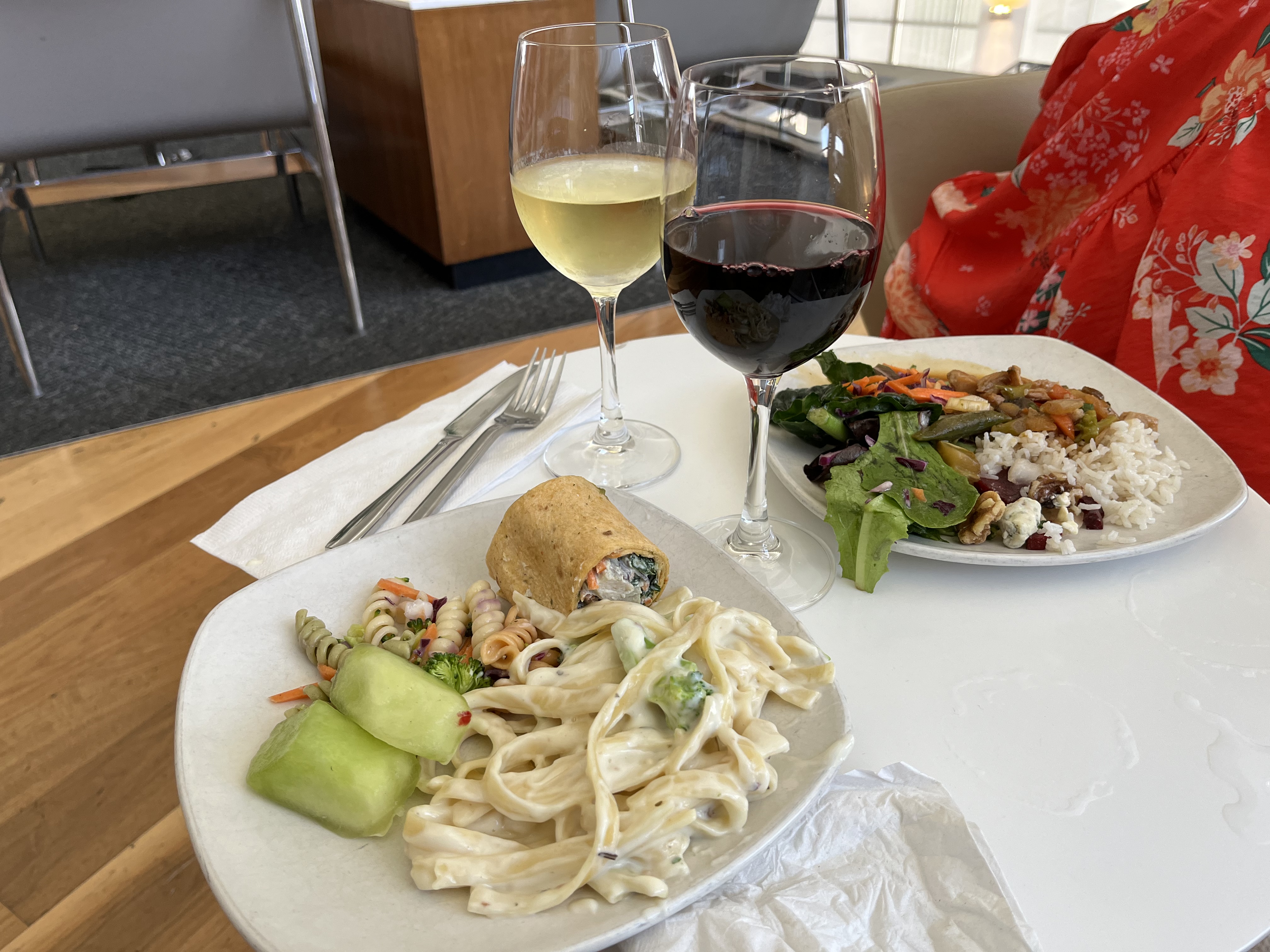 Hej från Polaris Lounge O’hare Chicago. Ganska folktomt, fick plats för en trevlig 3-rätters lunch med yngste sonen i ”the dining room” direkt.