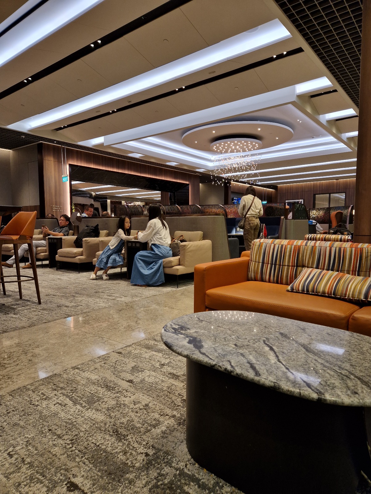 Silverkris på T3 Changi. Klockan är 05. Stor, luftig, snygg lounge. 200-300 platser?