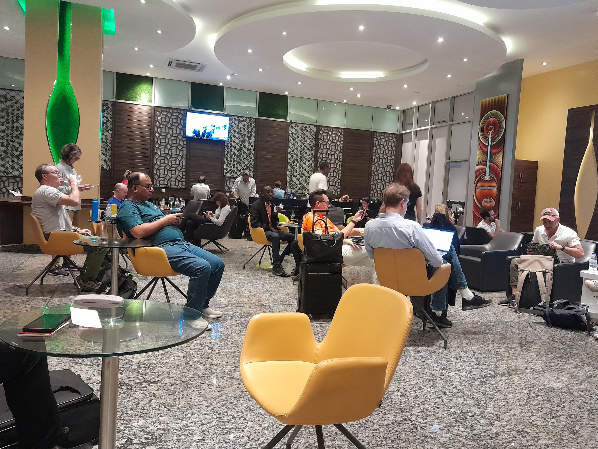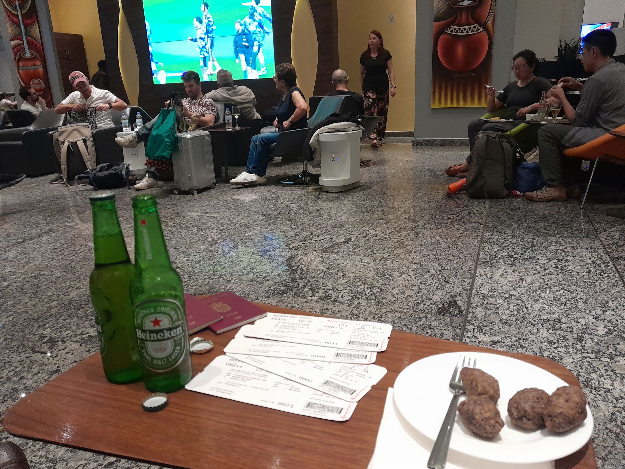 Pearl Lounge i Kigali. Ved check-in udskrev de alle 4 BP til slutdesinationen, well done, da de sidste ben er med VN fra BKK. Bagage maa hentes ud i Hanoi, men det er forventet. Loungen er fuld, masser af savory snacks, varme retter, Premier League. Flyveren til NBO er forsinket 30 minutter, saa jeg naar 1ste halvleg af ARS-LIV...