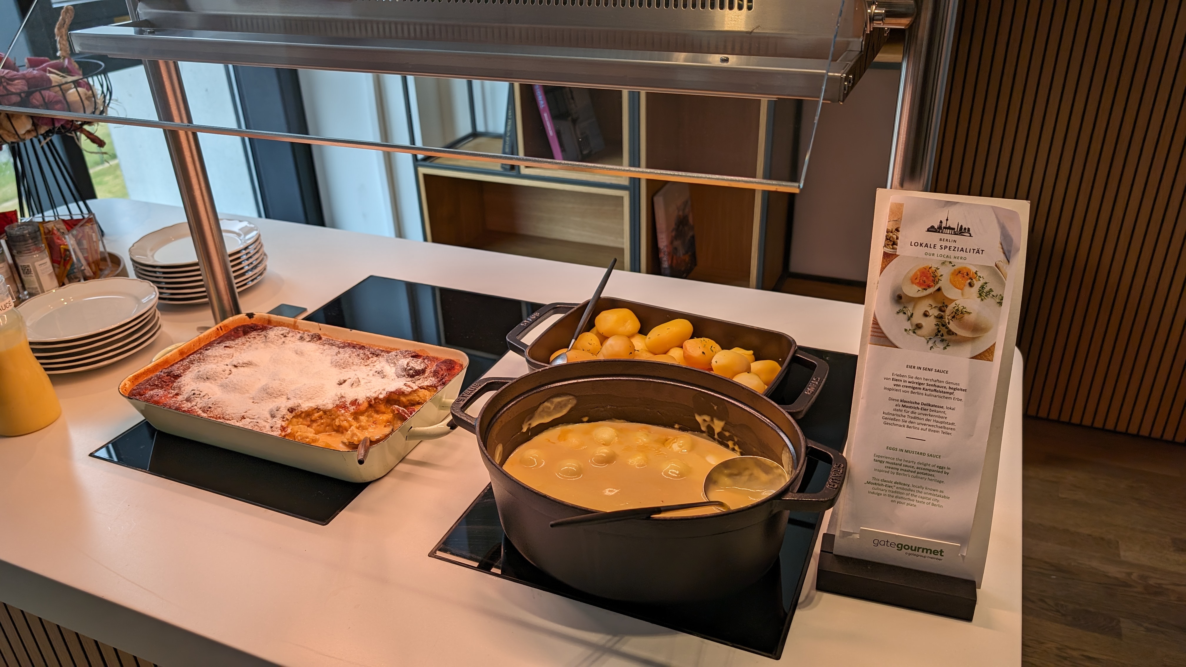Samma mat som i torsdags.Hälsningar från Lufthansa Senatorlounge I Berlin. Den lilla matstationen som brukar stå vid ingången är nu repositionerad till övriga buffén. Dagen till ära med "Ägg i senapssås". Som tur är finns det schnitzel å lite annat på andra sidan...