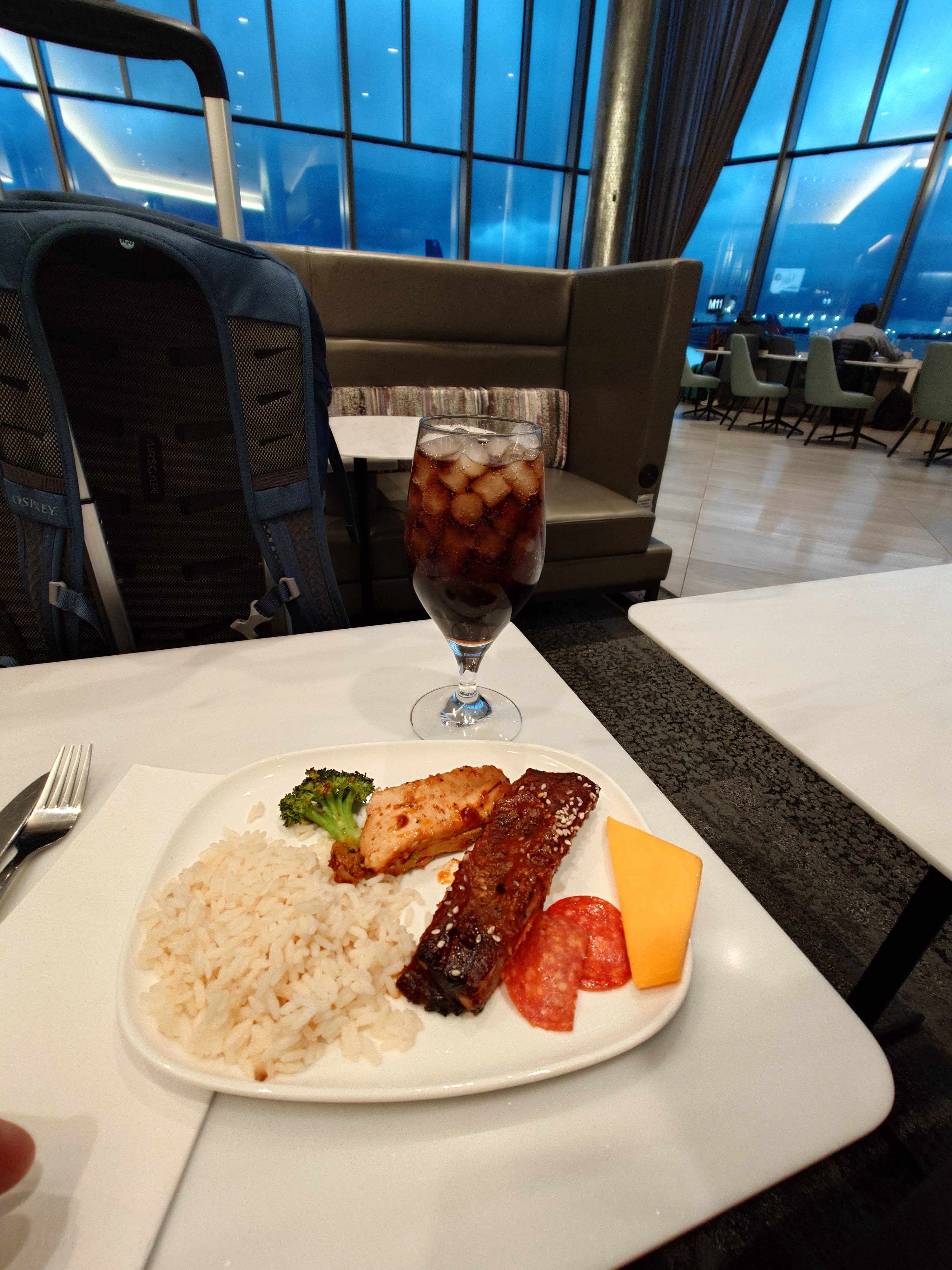 Välkomnad med öppna armar, och de var vana att se SAS-boardingkort. Loungen är gigantisk, och så här två timmar före SAS-avgången är den max 20% full, förmodligen mindre. Stora fönster ut mot plattan. Två (!) bemannade barer. Bra blandning av olika sittalternativ. Jag testade två av ee fyra varmrätterna, med beröm godkänt. Drinkarna är enligt amerikansk standard, dvs hälften sprit, hälften is och några droppar groggvirke som "garnering".