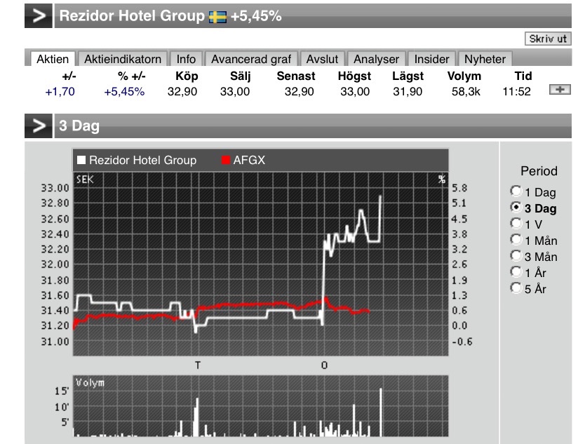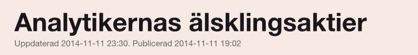 Igår tisdag 11/11 2014 på kvällen efter börsens stängning publicerar Dagens Industri en artikel där Rezidor höjs till skyarna. När börsen öppnade idag steg den med över 5%.