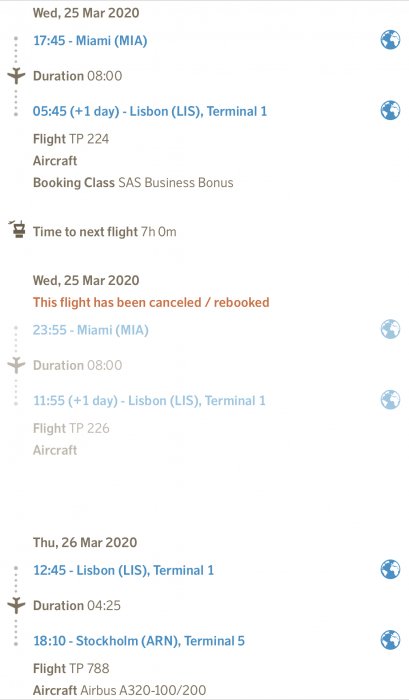 Hade en resa SJO-PTY-IST-MUC-ARN som blev ombokad till SJO-BOG-BCN-FRA-ARN men nu senast bara några timmar innan vi skulle påbörja resan så blir BCN-FRA cancellerad. Vi har ringt och fått en ny resa.