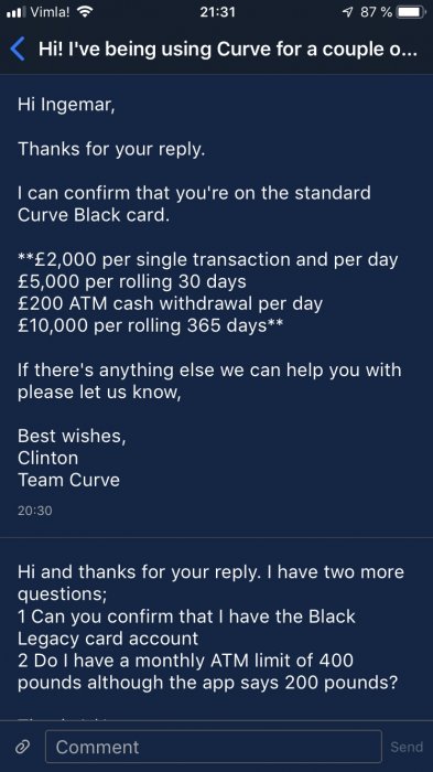 Jag ville få bekräftat att jag hade Legacy Black och passade då på att fråga om ATM limit. Svaret blev att det är 200 pund om dagen och 10000 pund på rullande 12 månader... Det var nytt för mig, känner ni igen detta?