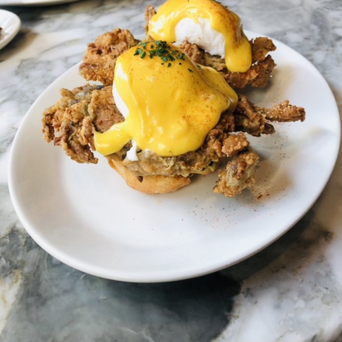 Lägger upp en måltid som jag med god aptit mumsade i mig, något jag aldrig hade sett förut: Egg Benedict med soft crab shell.