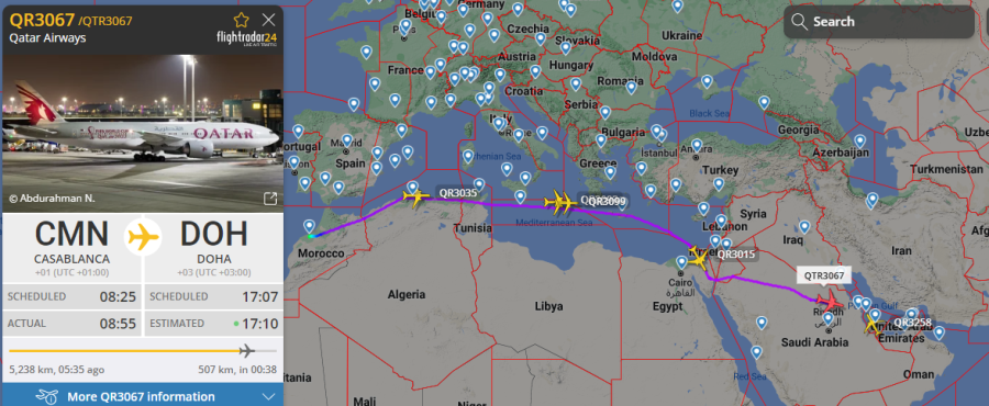 Både Qatar Airways och Royal Air Maroc körde förstås i båda riktningarna, Marocko hade hyrt in 5-6 plan från Wamos Air bl.a.Nu lär det väl varit fler plan än så i farten, men intressant att det enbart är Qatar Airways-plan dit och Royal Air Maroc-plan hem. Det är väl inte en allt för avlägsen gissning att Qatar Airways bjuder på resan hem för vinnarlaget nästa vecka?