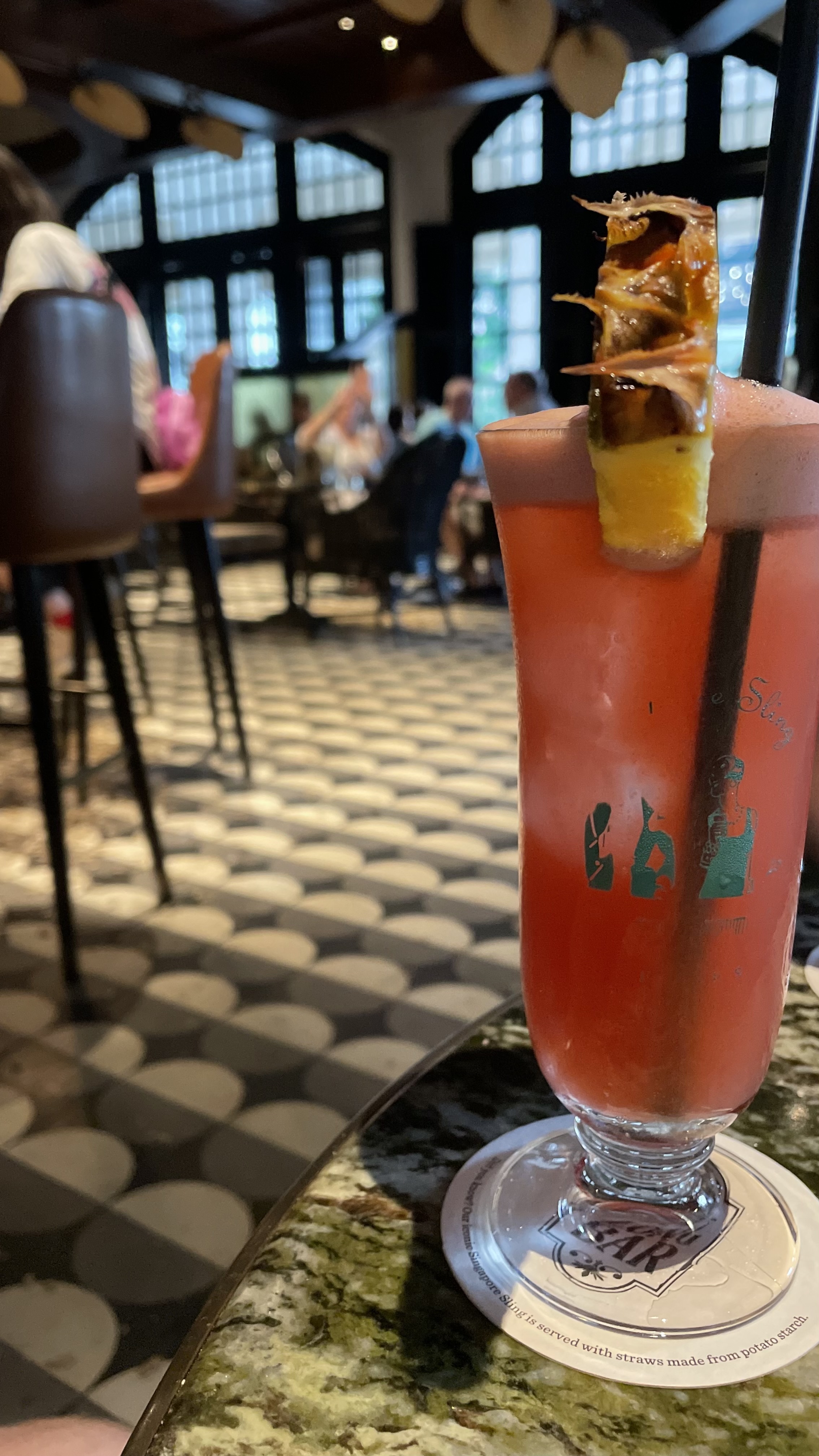 För 39 SGD borde man ju i vart fall få ett glas som inte är utslitet kan man tycka.Long Bar på Raffles i Singapore. 15 min och 39 SGD senare slank min första Sling ner. Kul att ha varit här åtminstone!