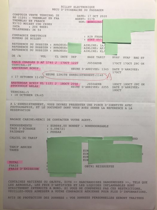 Den uniformerade Air France agenten bakom pulpeten förstod att jag hade svårt att höra henne genom hennes munskydd och plexiglaset som skiljde oss åt. Hon klickade på skriv ut och gick och hämtade ett papper, hon greppade en rosa överstrykningspenna och började mycket pedagogiskt stryka över ett antal av raderna.