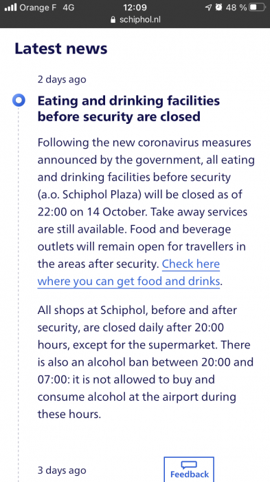Allting stängde senast klockan 20:00 alla dagar, allt utom dagligvaruaffären Albert Heijn som hade fått undantag. Mellan klockan 20:00 och 07:00 var det också totalt alkoholförbud på flygplatsen, både före och efter securityn, även inne i loungerna. Europa hade definitivt börjat stänga ned, man gjorde vad man kunde för att folk inte skulle vara ute och röra på sig. Man tog coronaviruset och dess härjningar på allvar och agerade därefter.