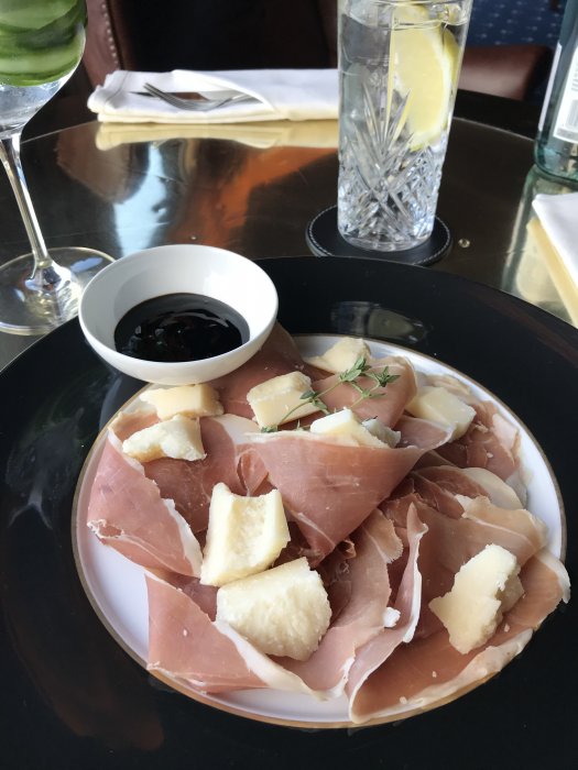 Jag satt helt själv i loungen och njöt av min drink, lugnet och livet i största allmänhet. Beställde in lite skinka och ost som förrätt och tilltugg. Det tog inte lång stund för dem att ta in en full tallrik: