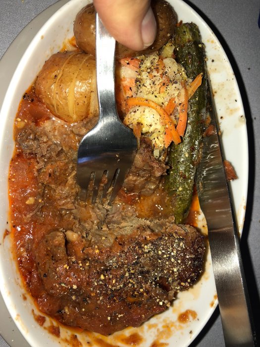 Sedan hade jag med mig lite oxfilé hemifrån som jag inte ville slänga. Passade utmärkt med potatismoset