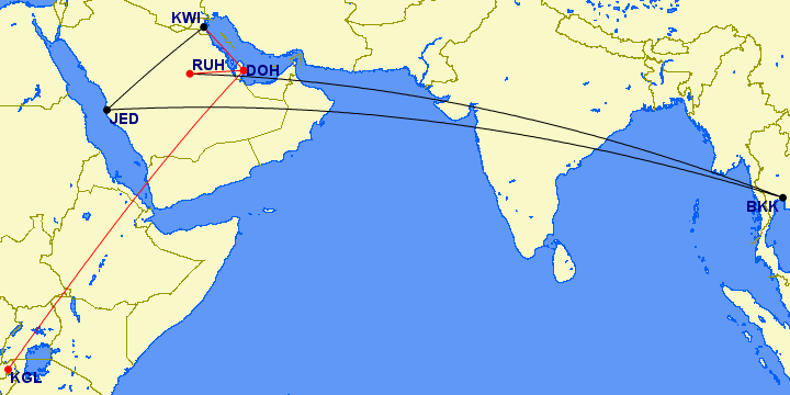 25 Oct. 23:00 KGL DOH 06:20 WB B737-800 Economy X (QR award)