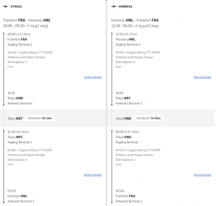 Velade länge om jag skulle testa EVA AIR och deras ganska nya kabin i C på hemvägen via TPE & BKK som också fanns tillgängligt men beslutade mig för att det fick bli en F-resa hela vägen denna gång. Har inga större förhoppningar att Japan kommer ha öppet Februari-22 vilket gör att jag kanske måste boka om Tokyo - Hawaii delen då resan som den är nu innefattar byte av flygplats i Japan men så länge får bokningen var så här.
