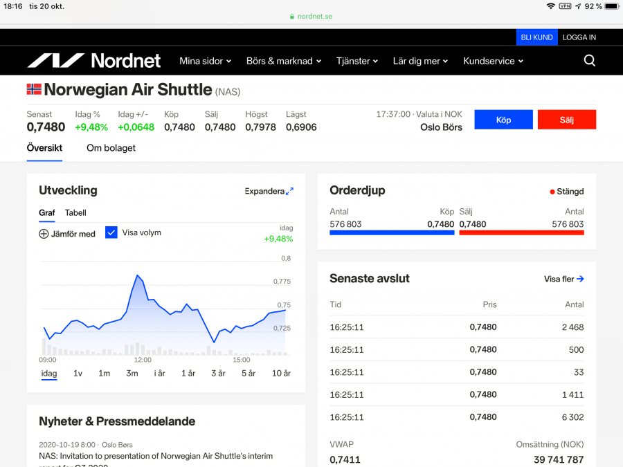 Kanske (spekulation, men börsen tenderar hitta intressanta samband....) kan ha att göra med att American Airlines ämnar återuppta trafik med 737-max innan årsskiftet och att tillstånd etc är på plats.Försökt att hitta vad gör att Norwegian aktien stiger, men kan inte hitta något i Norsk press, upp även idag med 9,5%