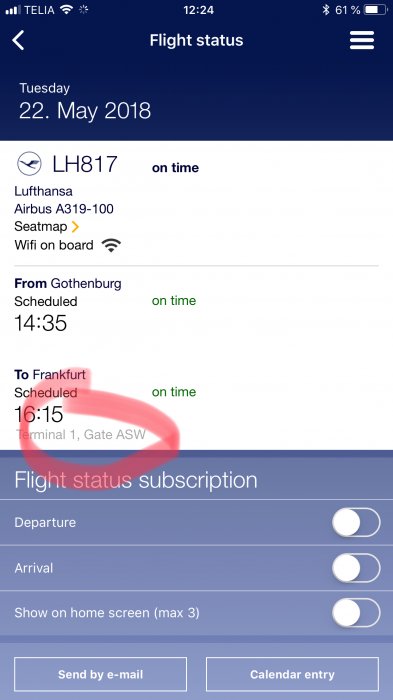 Hade gärna åkt från Arlanda men GOT passade bäst i detta fall. Hur tänker du att jag kan följa flighten i appen?Manuell inchecking hos SAS i Göteborg ger nog ingen pangstart på resan. Så du kan lika gärna checka in via Lufthansaappen. Där kan du följa flighten och se om det blir apron och därmed bil.
