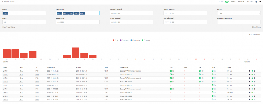 Sitter och spanar efter F med Lufthansa FRA/MUC-MIA med alla möjliga larm och tycker det är rätt gott om platser att släppa award på många dagar men ser aldrig någon availability. Jag tittar 1-3 veckor fram. Är väl inte så förvånad men är det någon som har erfarenhet av denna sträcka ur tillgänglighetsperspektivet? Det släpps dock en hel del business några dagar innan avgång.