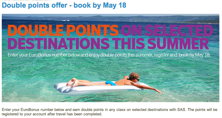 "Enter your EuroBonus number below and earn double points in any class on selected destinations with SAS. The points will be registered to your account after travel has been completed."