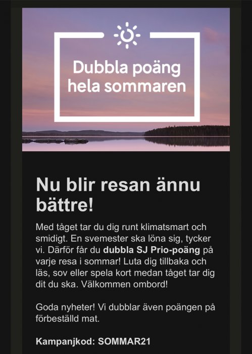 Erbjudandet gäller för resor med SJs dagtåg och på förbeställd mat. Gäller på alla resor som du köper från och med 1 juni, sista resdag är 31 augusti 2021. Poängen får du efter resan. Erbjudandet kan ej kombineras med andra erbjudanden.