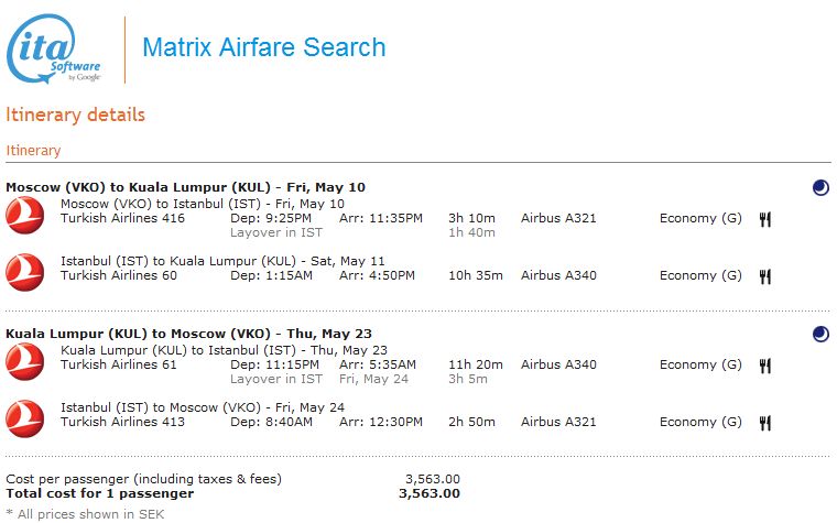 [Economy class] Moskva-Kuala Lumpur T/R, Turkish Airlines, 3.570 SEK inkl. skatter