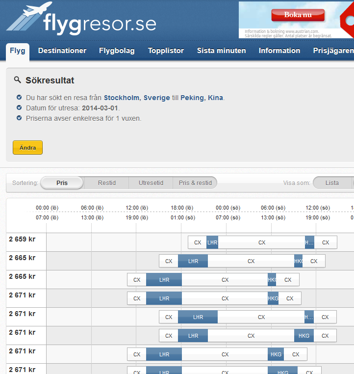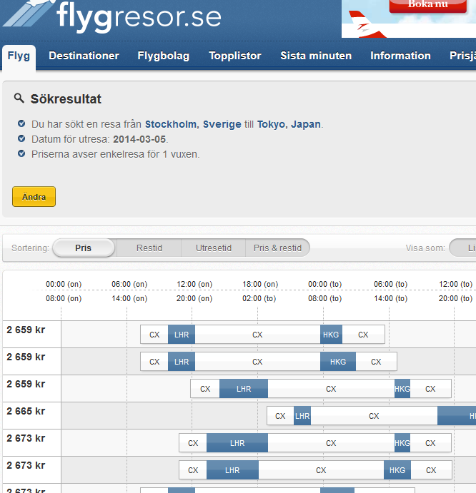 Priserna är baserade från Expedias webbsida som visar vilken bokningsklass man bokas i. Man kan hitta billigare hos andra resebyråer.