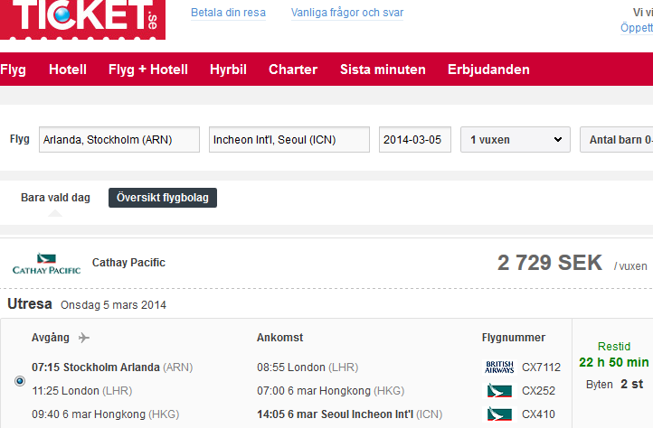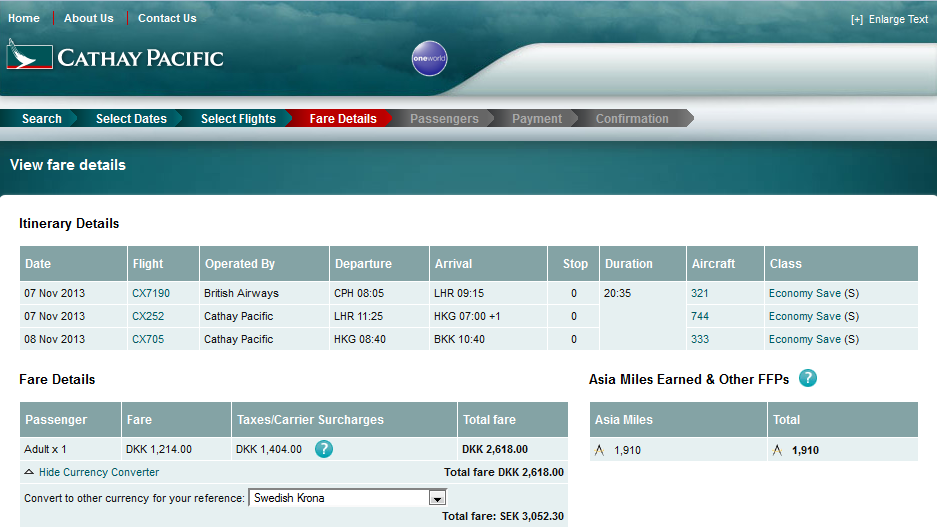 Det går inte boka från Cathay Pacifics webbsida därför måste man boka via någon resebyrå.
