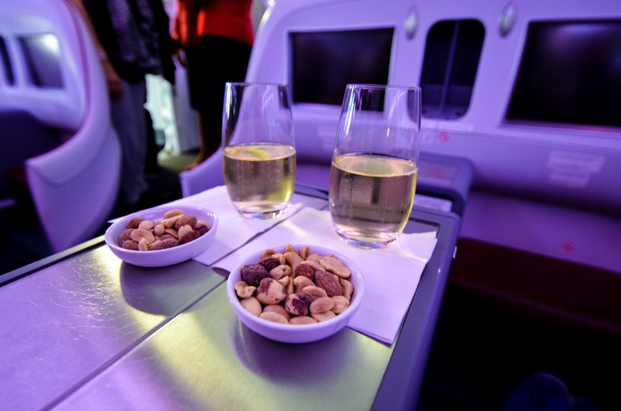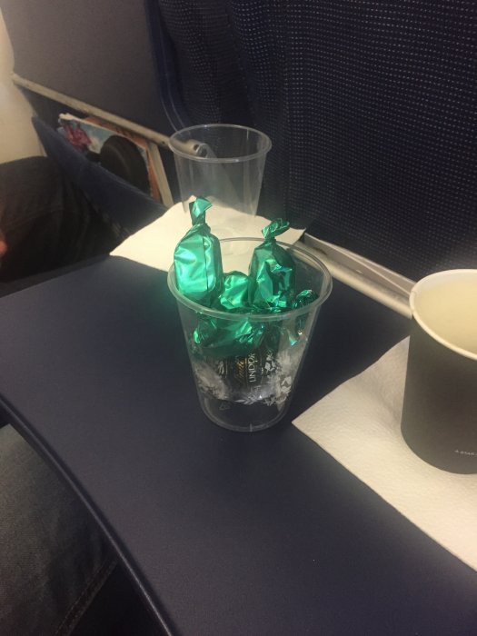 När pursern rullade tillbaka med serveringsvagnen efter att ha serverat resten av kabinen så bjöds det lite diskret på choklad.