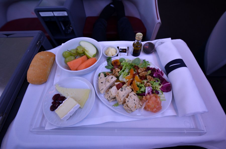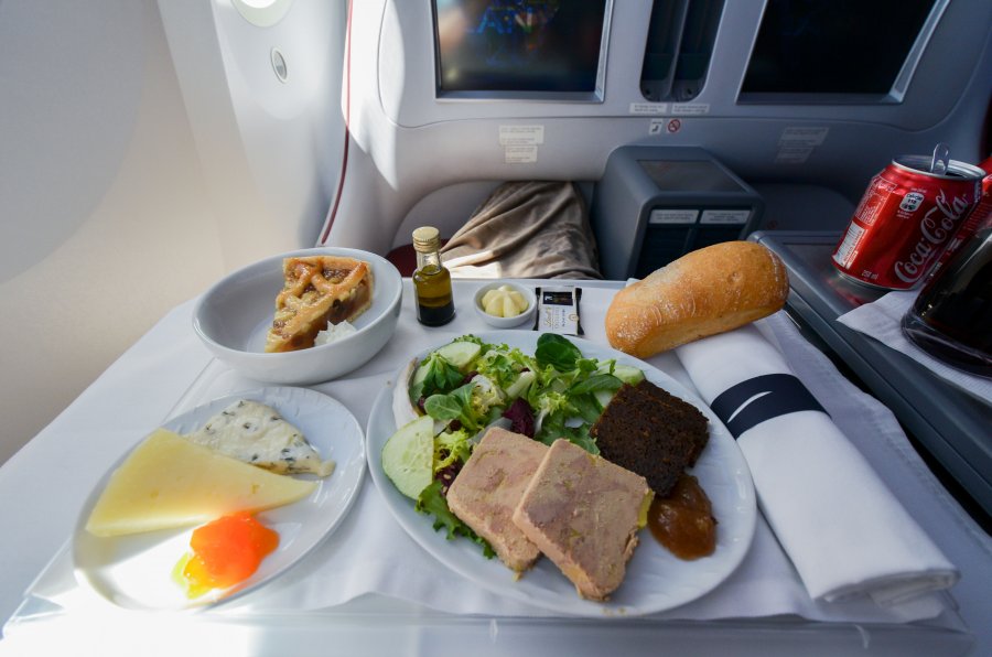 På vägen hem serverades foie gras med tillhörande rågbröd och sallad, två bitar ost och lite marmelad/sylt samt en bit äppelpaj.