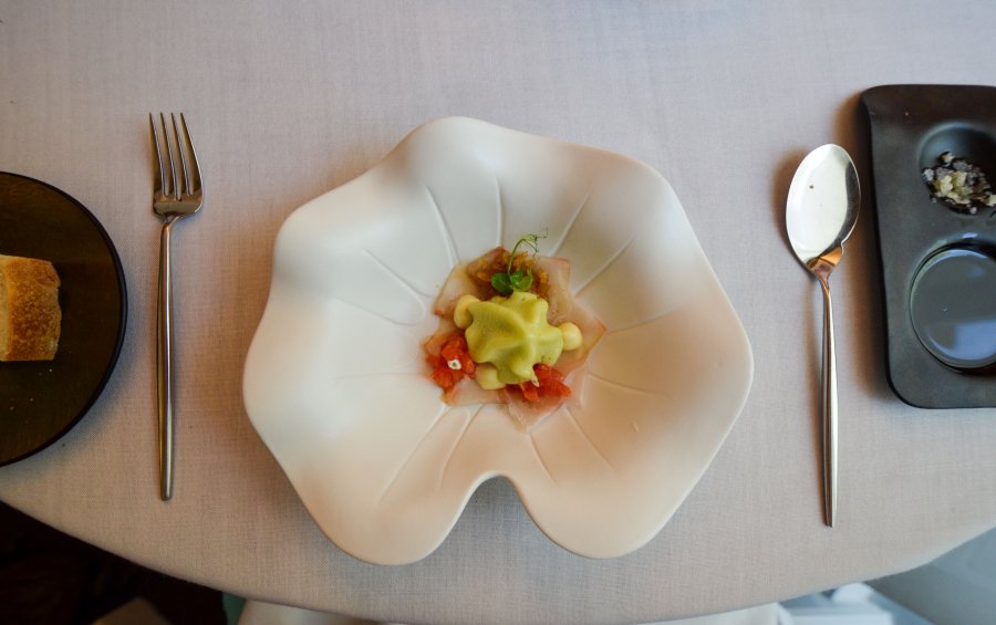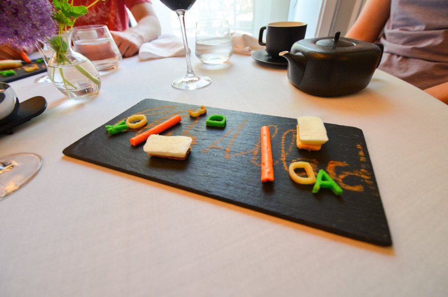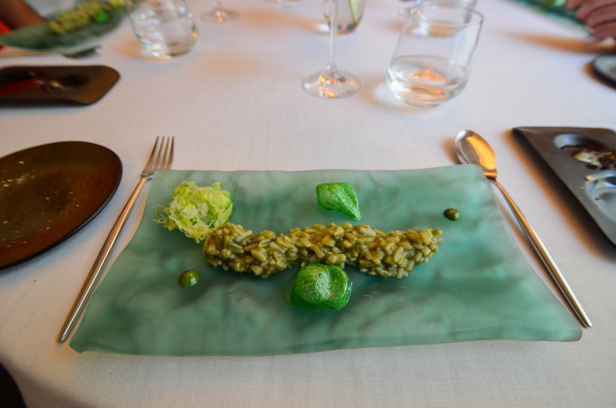 Vi undrade vad vi skulle ha den till, när en servitör berättade att det vi trodde var visitkort i själva verket var gjorda av rispapper och ätbara, de skulle alltså användas som "sked".