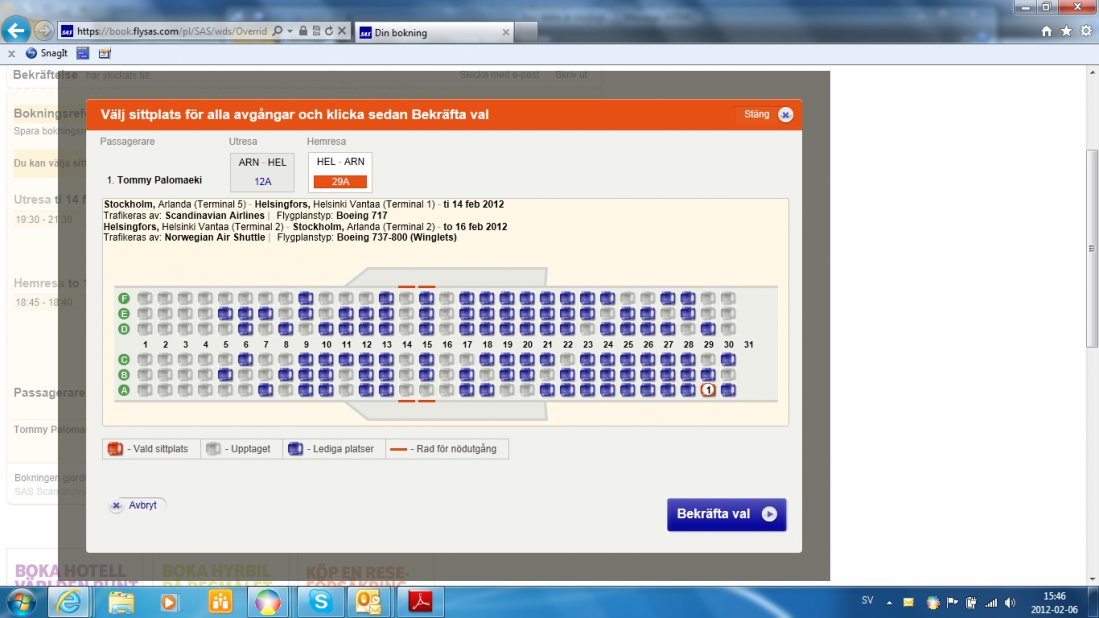 5. Se bilden nedan när jag ville välja plats på mina Sk/KF avgångar. OBS: Jag sökte bokningen genom http://www.sas.se/Misc/Services/Mina-bokningar/