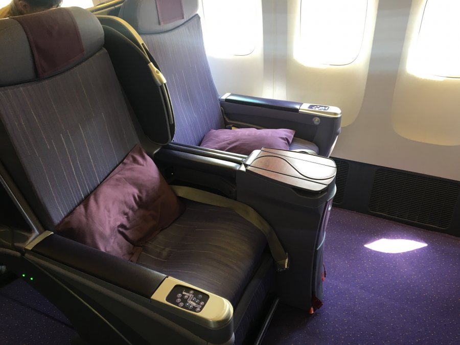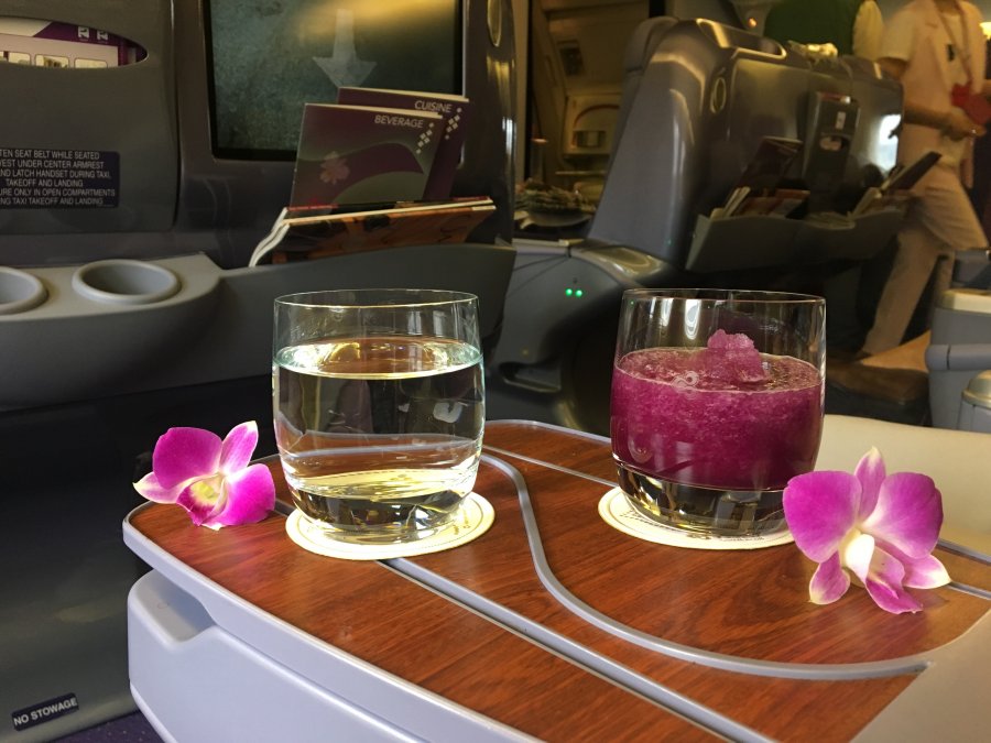 När vi klev ombord på Thai till Singapore blev det ett glas vatten och en signaturdrink med violsmak.