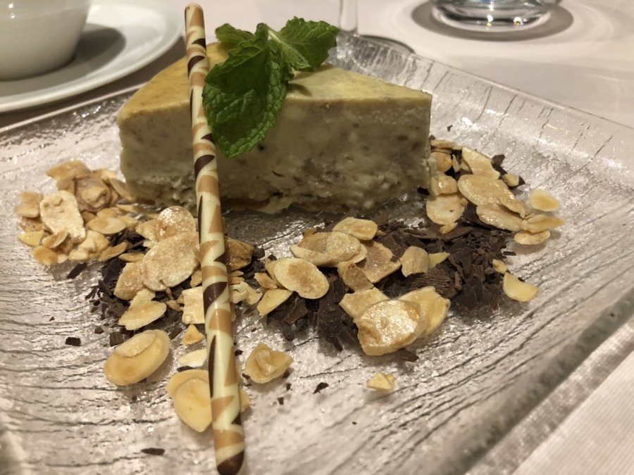 Till efterrätt frågade vi om det fanns någon cheescake. Tyvärr inte, blev svaret men det fanns lite efterrätter borta vid självplocken. Väl vid självplocken stod det att det fanns banancheescake på beställning. Märkligt att inte ha den med på efterrättsmenyn då och säga att det inte finns. Nåväl, väl där gick det bra att beställa en sådan förstås.