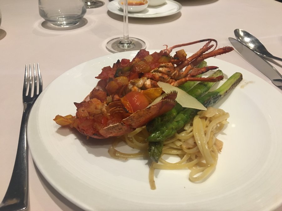 Skillnaden mellan lunchmenyn och middagsmenyn var att det fanns hummer. Det var lite tråkigt att det inte var större skillnad än så. Men det fick väl bli en sådan samtidigt som mitt sällskap tog havsabborren jag hade till lunch. Den var riktigt god medan hummern inte var något särskilt måste jag säga.