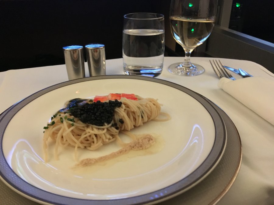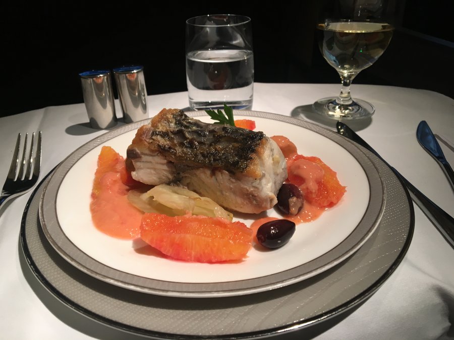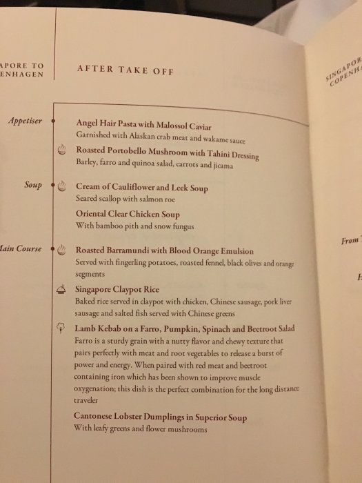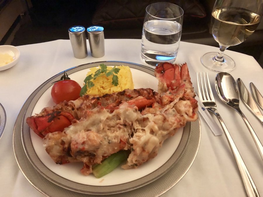 Flygningen blev bra och mitt sällskap hade beställt hummer via ”Book the Cook” och den var mycket bättre än i loungen. Jag tog fisk från ordinarie menyn. Den var inte så vidare spännande måste jag säga men den gick ner. Till förrätt blev det någon modell av kaviar men den vanliga presentationen som man får från Köpenhamn var mycket bättre.