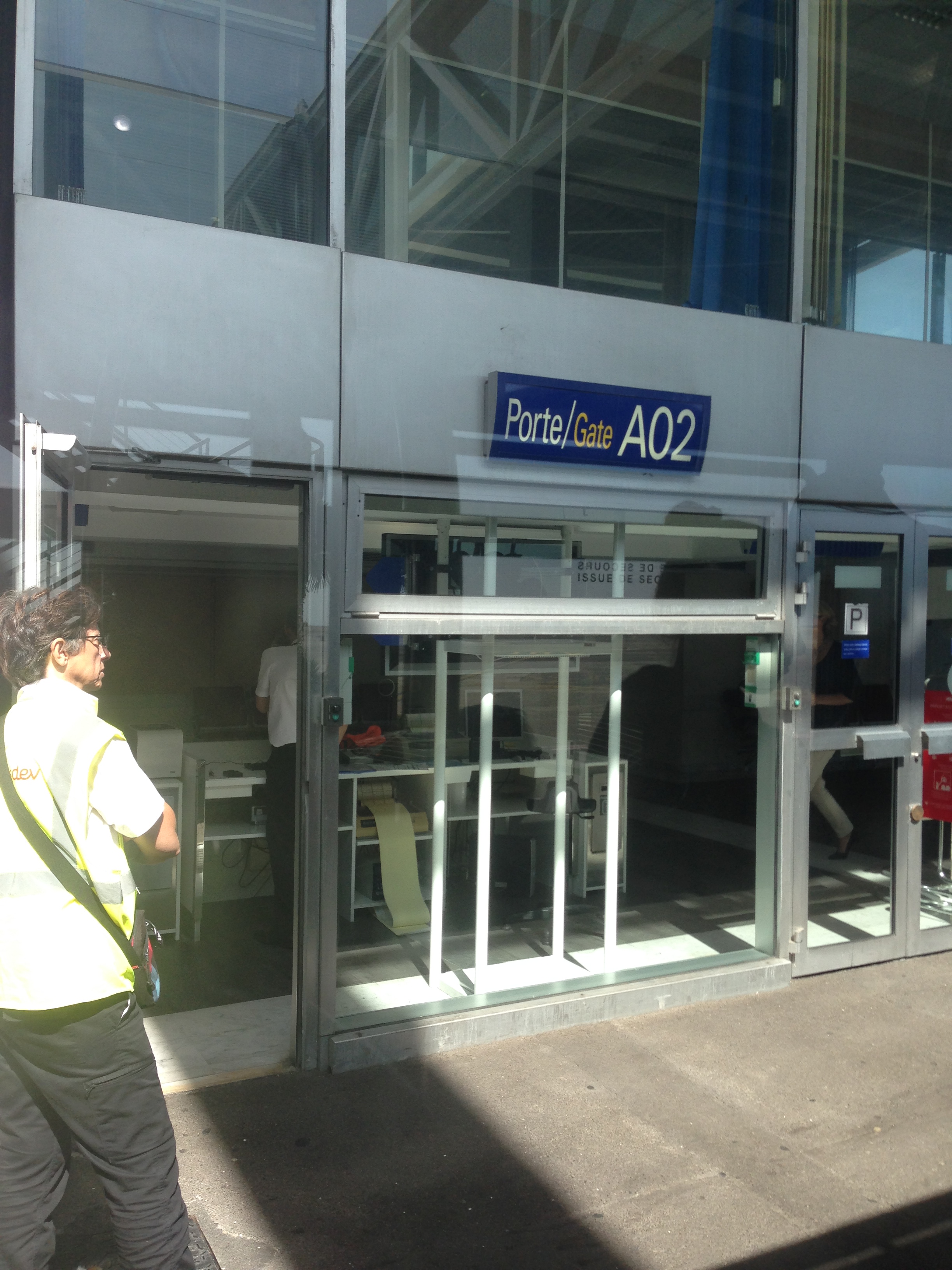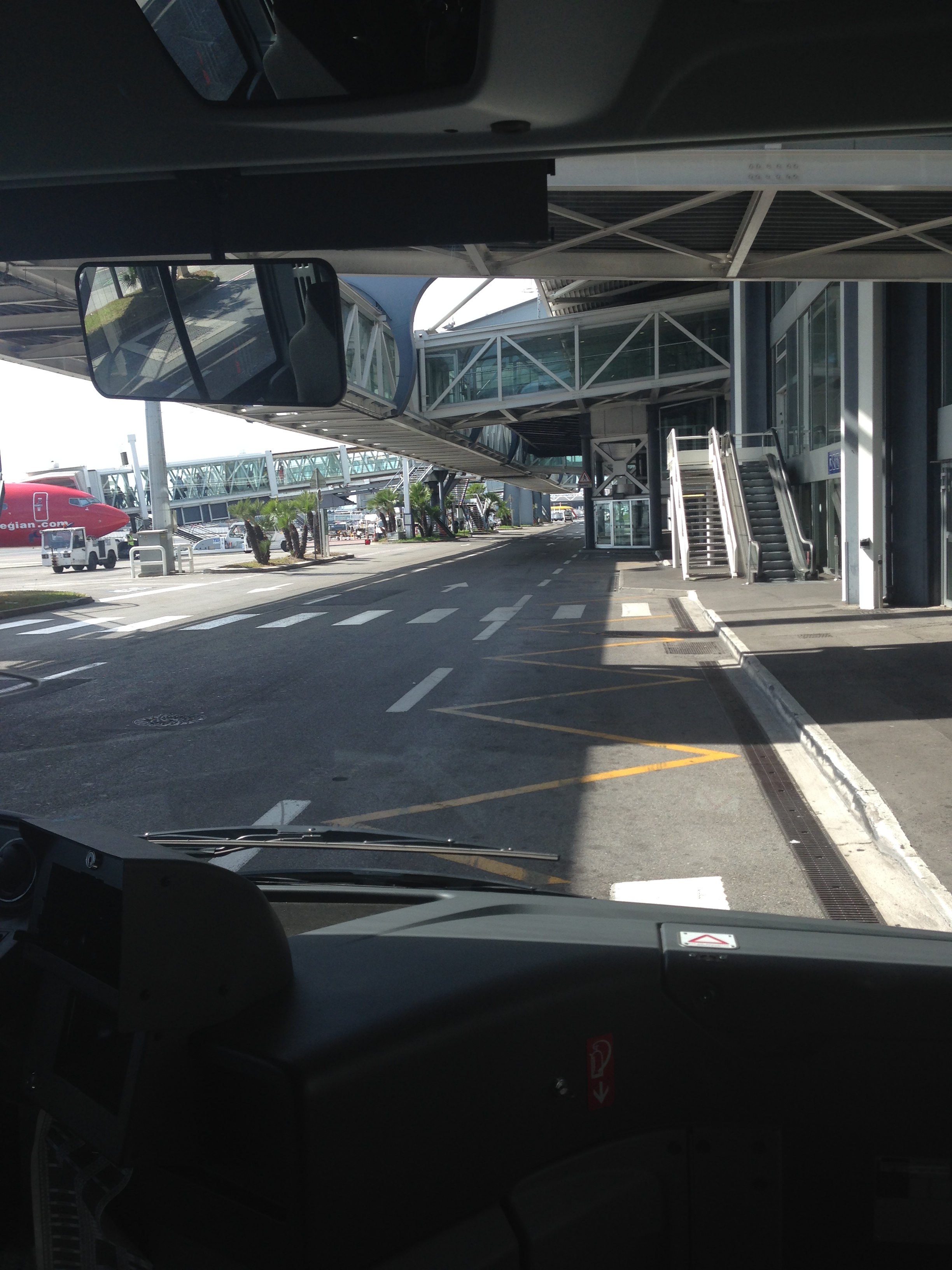 Vi landar i Nice och då tillråga på allt, hamnar vi utan gate och måste åka buss in till terminalen.