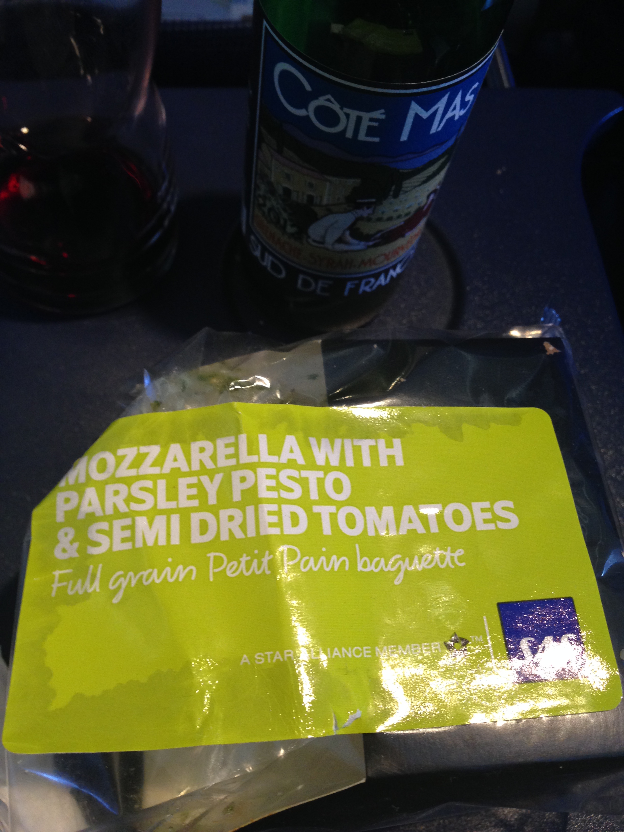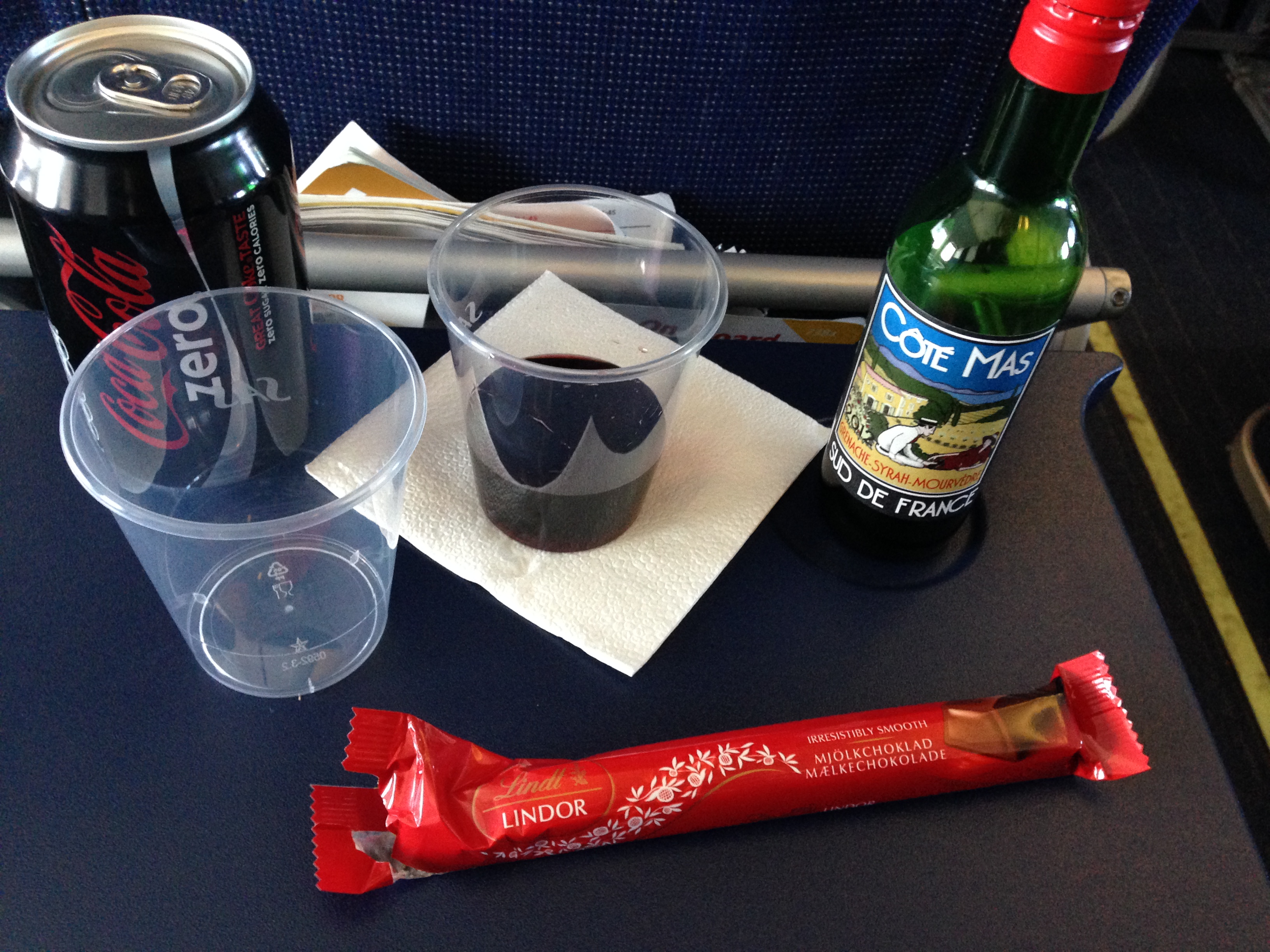 Snackar med Stewarden och rättsom det så har jag ett 3 sätte i SAS Go för mig själv och njuter av vin och choklad på nytt i halvliggande ställning