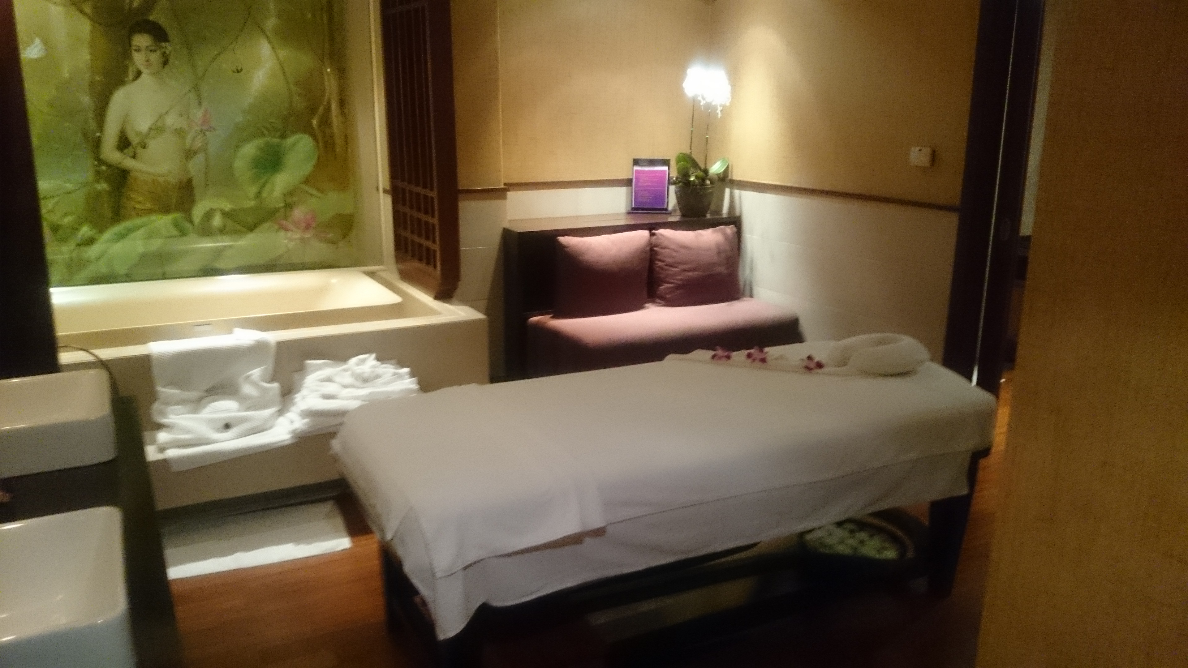 För att komma till massagen får man först gå ut från loungen och snett mitt emot ligger Royal Orchid Spa. Blir välkomnad och visad till ett rum med massagebänk och badkar/dusch.