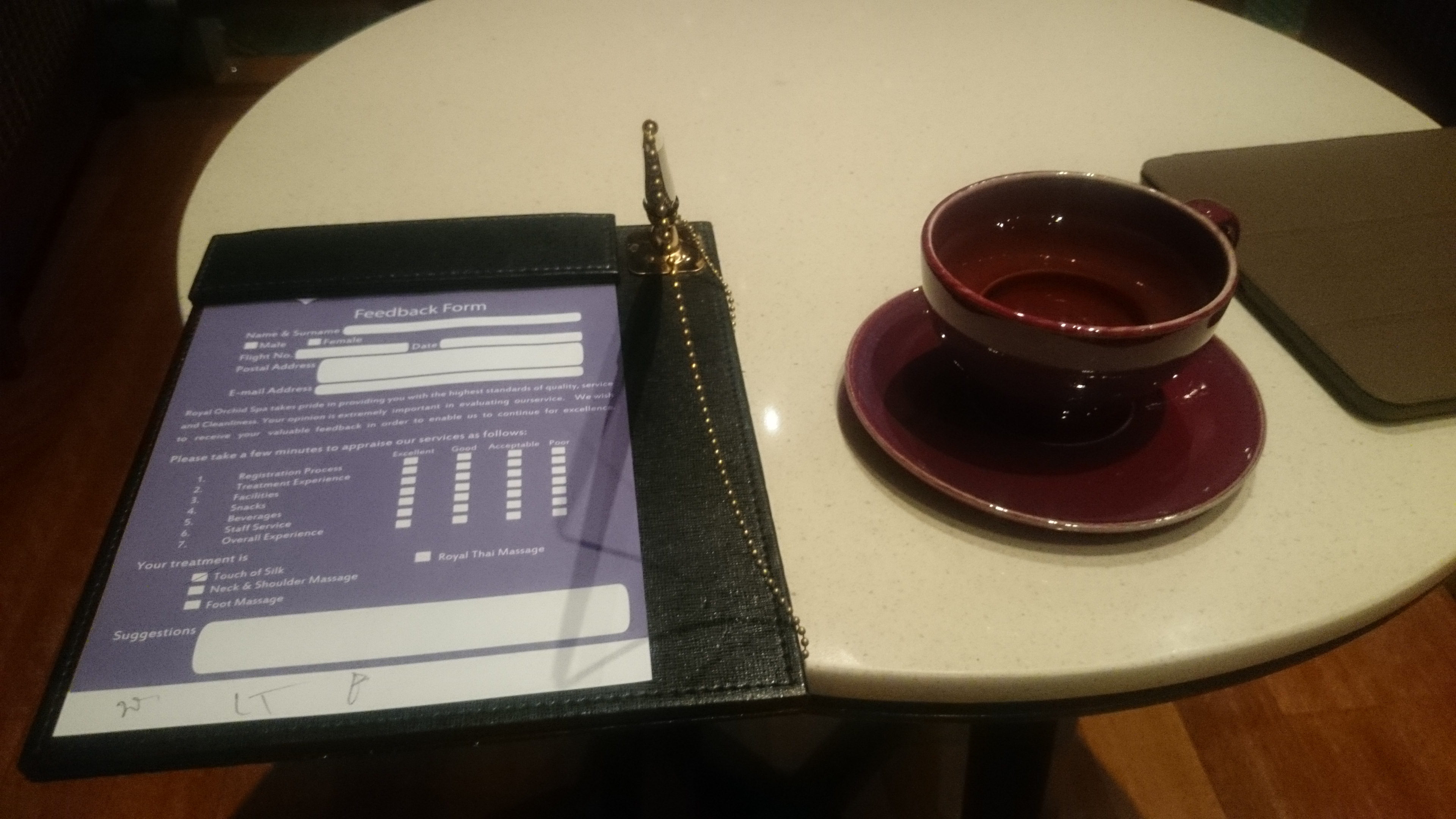 En timmes helkroppsmassage ingår oavsett om man har en betald eller bonusresa bokad med Thai i första klass något som är helt otroligt bra enligt mig. Massagen var ett perfekt sätt att avsluta en lång dag i Bangkok och lagom mossig reser jag mig upp från bänken efter en timme. Tar mig en dusch och byter om innan jag kommer ut och blir erbjuden en kopp te och dom frågar ifall jag kan fylla i en lapp med betyg på behandlingen vilket jag självklart tog mig tid och gjorde.