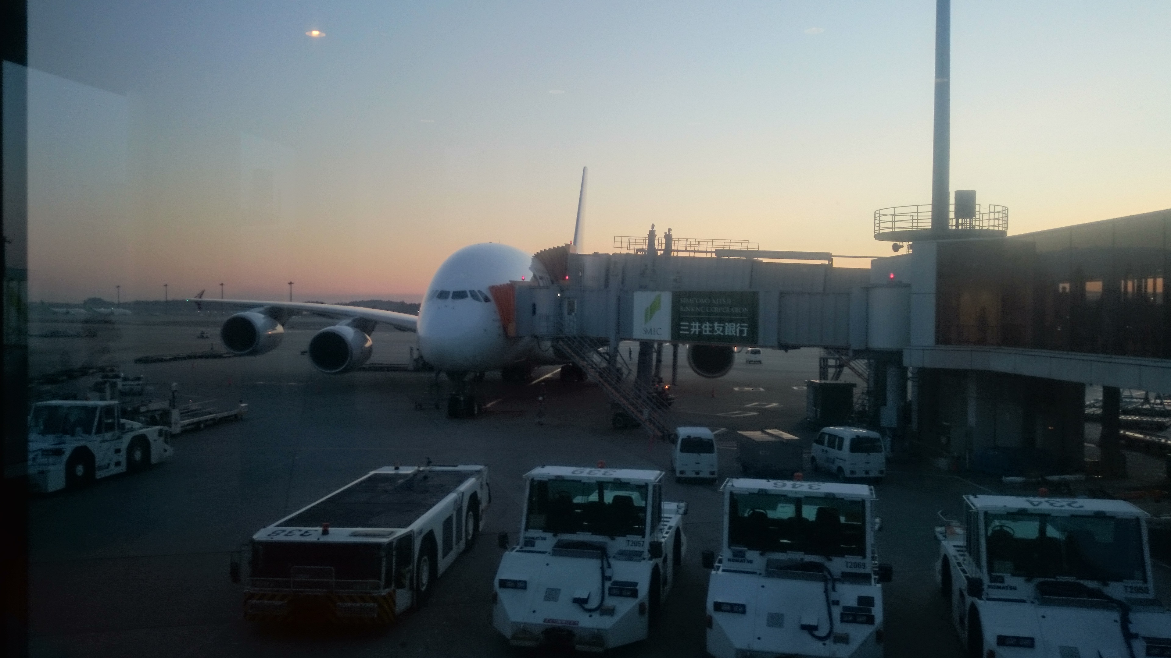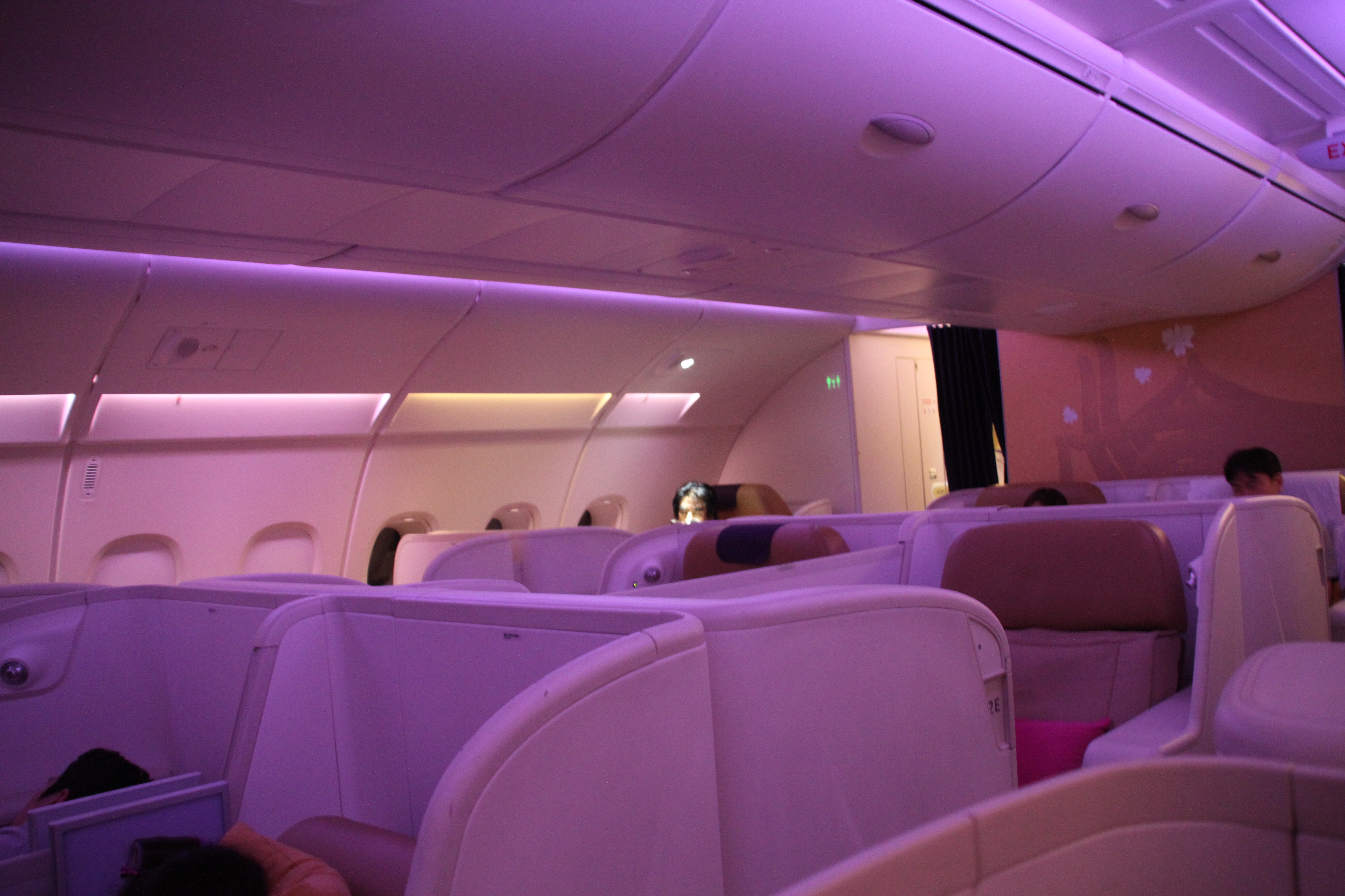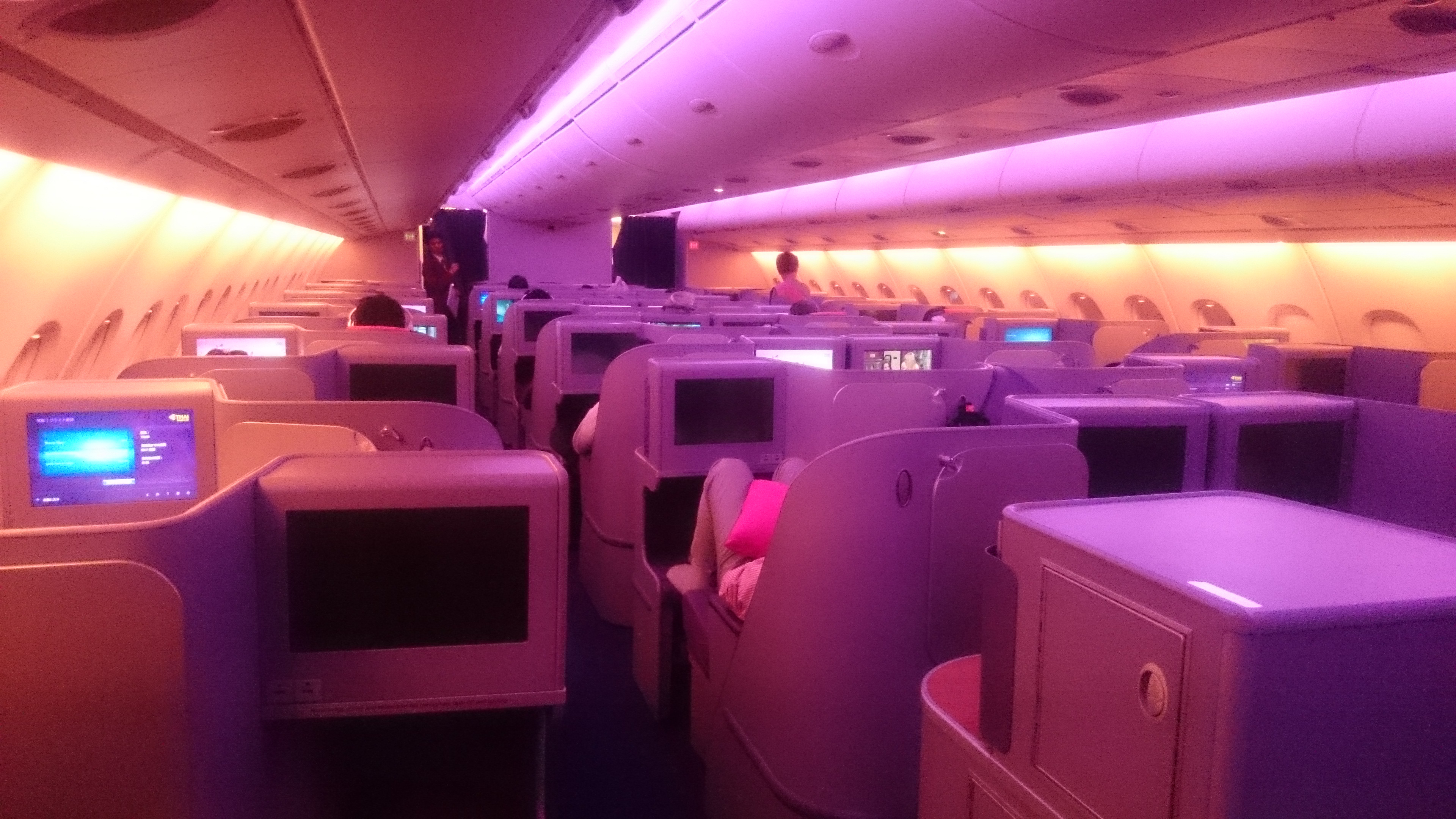 En trappa upp blev det och en lång uppförsbacke mot planet och jag blir välkomnad på det vanliga sättet med en bugning och blir snabbt visad till min plats 1A.