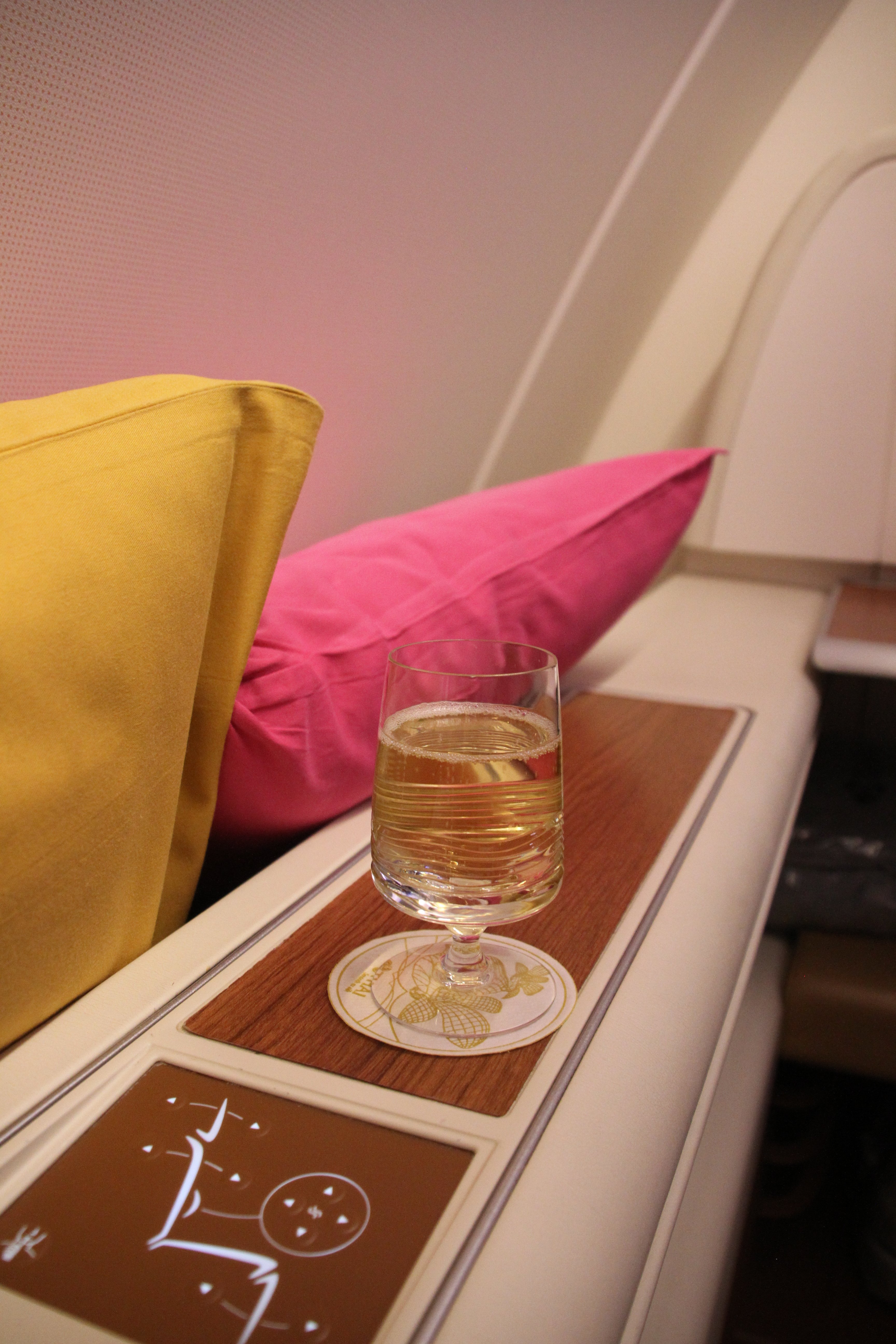 Mestadels av flygningen sitter jag sedan i mitt säte och kollar film och dricker Champagne. Till skillnad från vad personalen ombord säkert är vana vid med första klass passagerare dyker jag ut i galley några gånger och ber om påfyllning av glaset och lite mer nötter att knapra på. Får även öppna en champagneflaska när det är dags för en ny, väldigt trevligt crew och pratglada