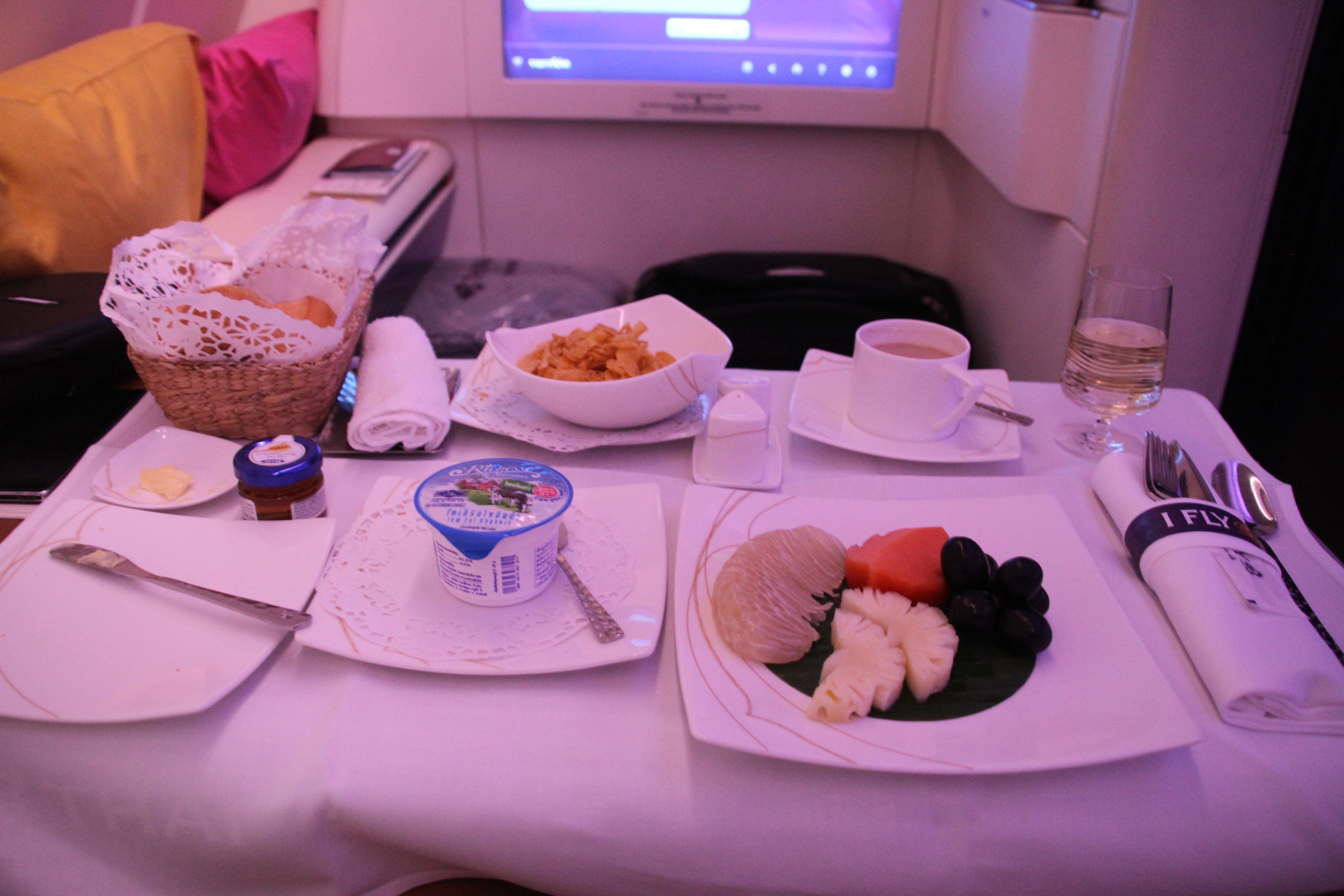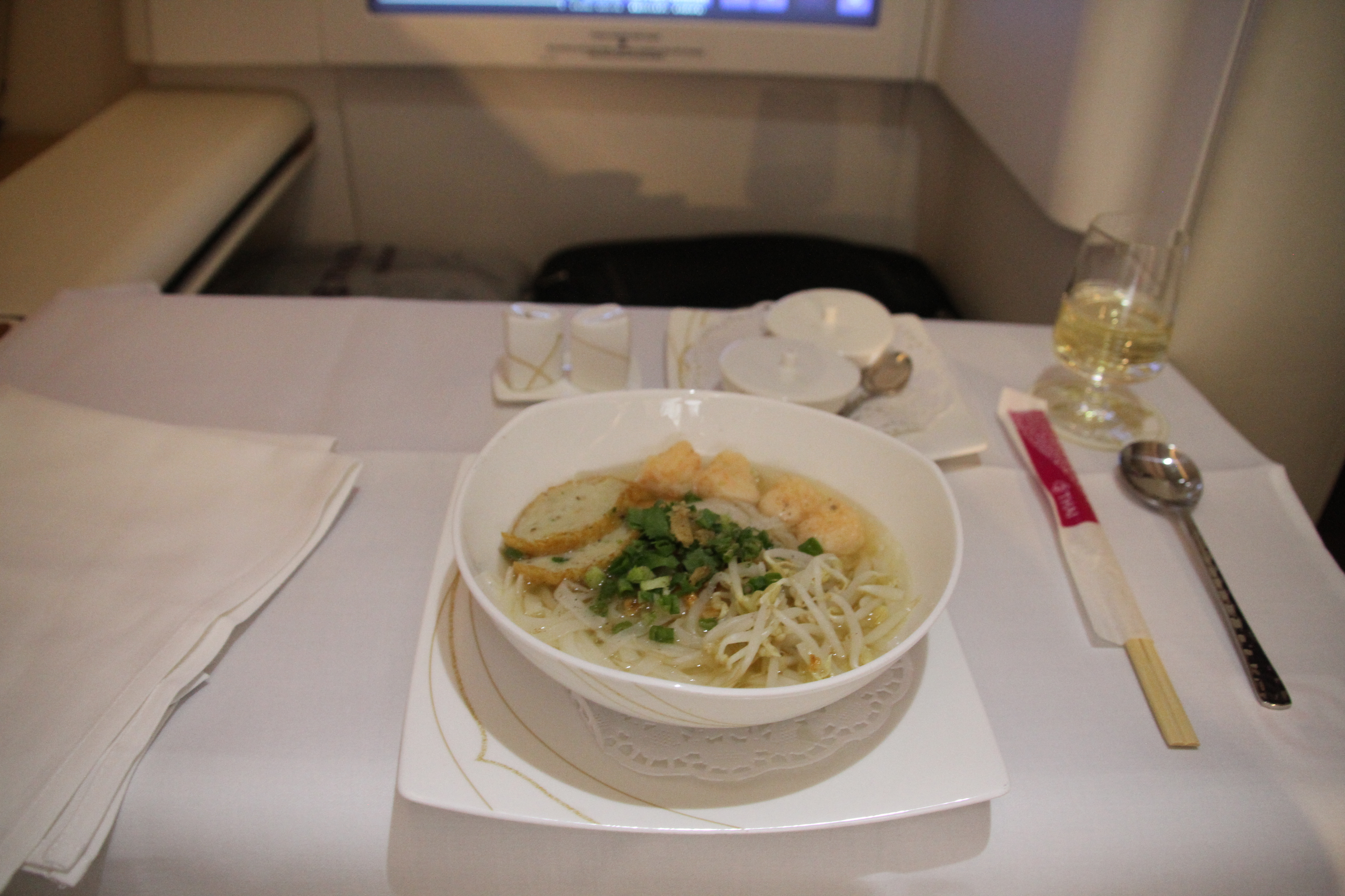 Då det är en relativt kort flygning och avgången är sent på kvällen väljer dom flesta i kabinen att sova. Jag själv beställer in den lättare middagen som mer var en nattmåltid i form av en soppa med lite små appertifer till.