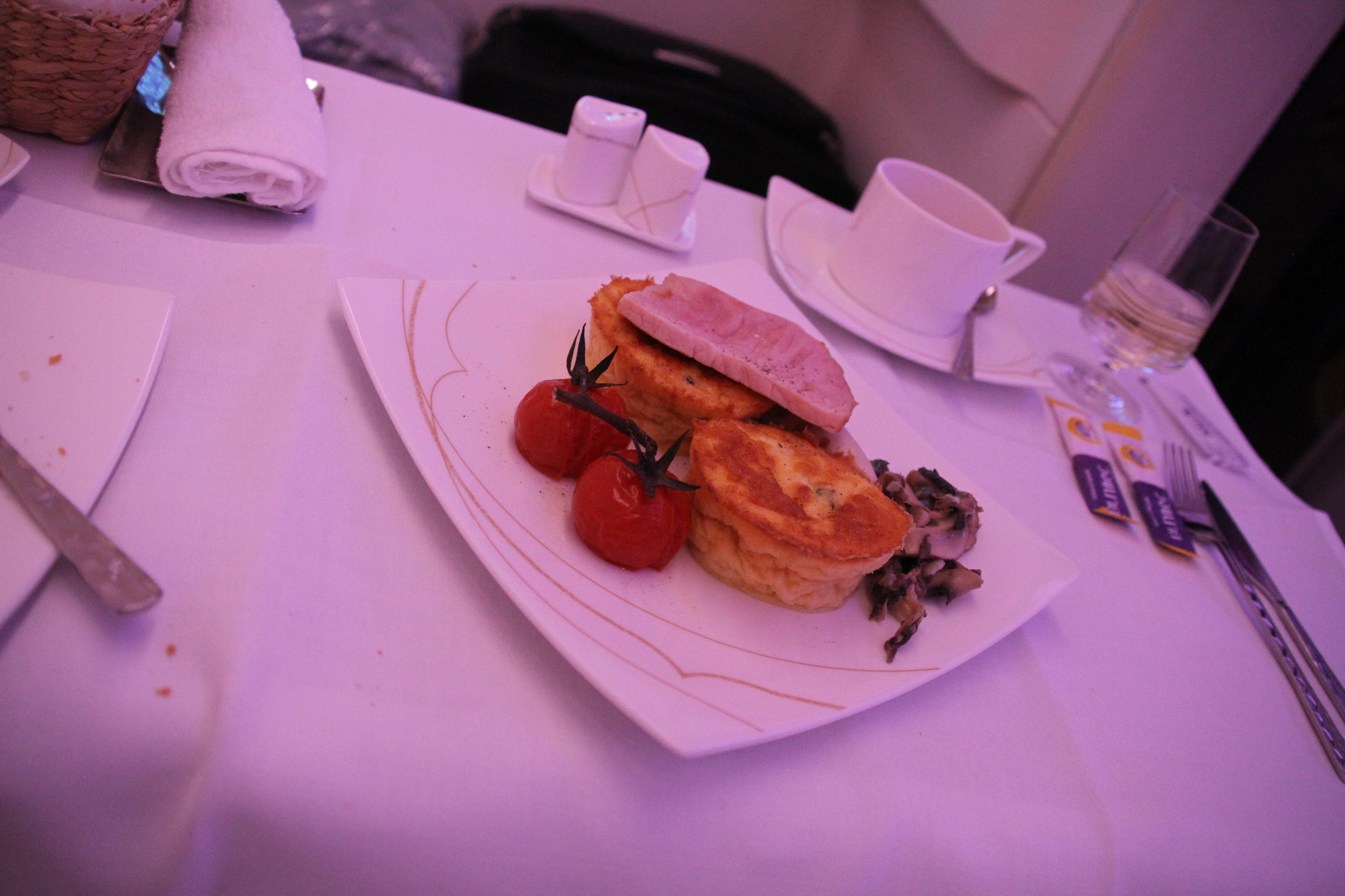 Jag beställer in en stor frukost bestående av flingor, naturell yoghurt, färsk frukt. Tar alternativ två på main course som är en omelett typ med tomater och svamp tillsammans med skinka.