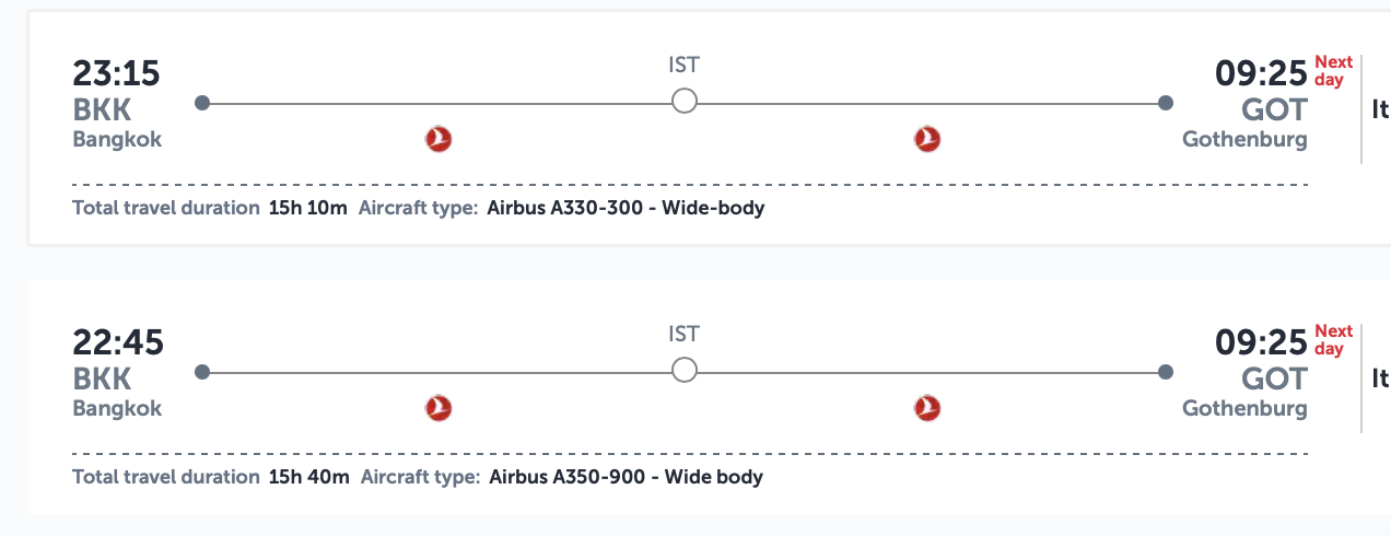 Jag ska boka Turkish Airlines från Bangkok till Göteborg och får upp två alternativ med samma ankomsttid men olika flygplan.