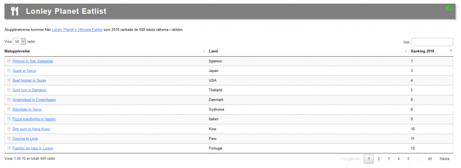 Ätupplevelserna kommer från Lonely Planet’s Ultimate Eatlist som 2018 rankade de 500 bästa rätterna i världen. Alla upplevelser är kodade gentemot respektive land och återfinns via alla sökfunktioner på sidan.