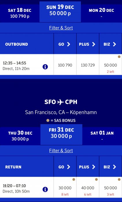 Exempelvis Köpenhamn-San Fransisco-Köpenhamn i business för 2 personer. 19/12-31/12 - vem kniper den snabbast? (Kommentera gärna om du bokade)