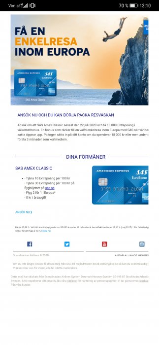 Då var dom snabba. Jag sa upp mitt kort för typ 2 veckor sen. Vi kör med fruns premium tills vidare...Frågade i Amex-chatten om detta erbjudande och enligt den jag pratade med så var detta erbjudande endast riktat till tidigare Amex-kunder så skulle inte gå att utnyttja för befintliga kunder.