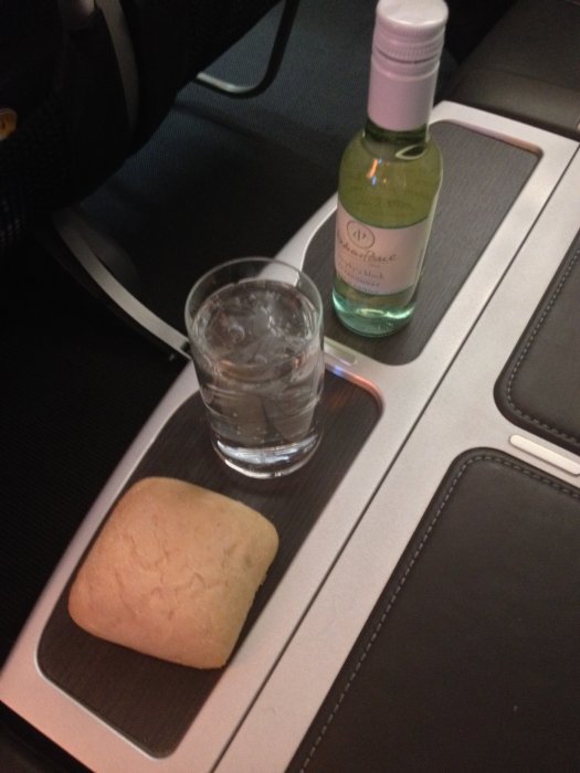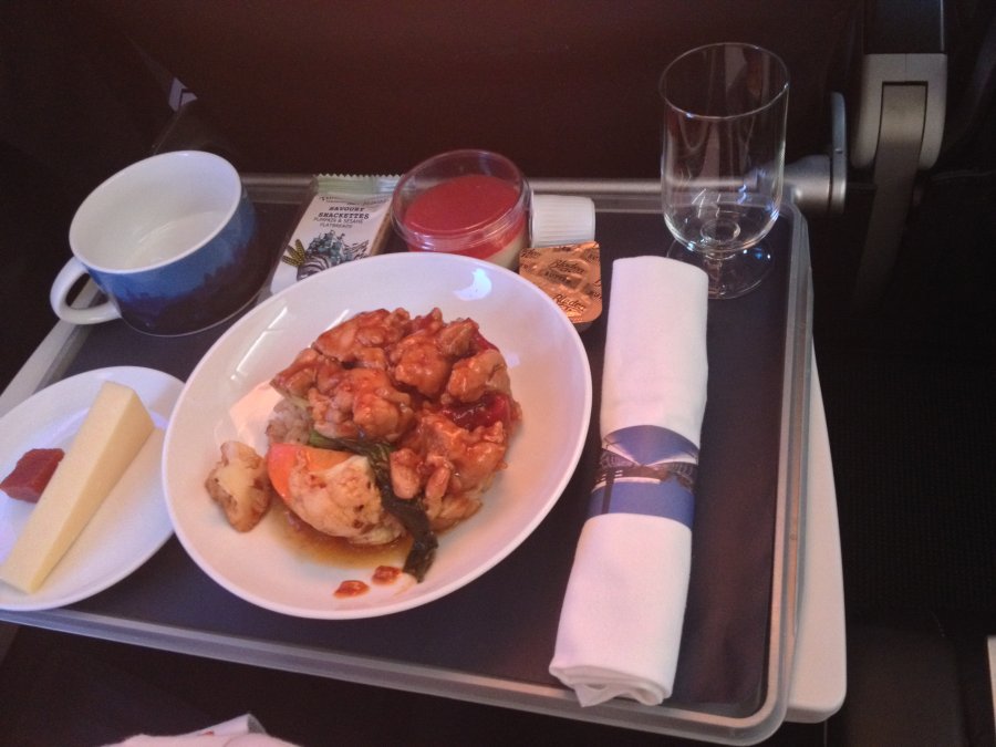 Priority boarding fungerede fint, men dog en del som "bare" var sølv/guld kort holdere i køen så det føltes ikke helt så eksklusivt, men kom om bord hurtigt. Sæderne i business kabinen er egentlig 3-3, men de har blokeret alle midtersæder så seating er 2-2 med et lille bord i midtersædet. Jeg sad på 2A som var rigtig fint, men "normal" benplads. Der var ingen servering før afgang men FA tog min jakke og hang det i skabet. Efter take-off gik der vel 15 minutter så var der servering af mad - der var valg mellem reje/lakse salat (kold) og sweet/sour kylling med ris. Der blev ikke lagt op til pre-dinner drinks. Jeg valgte kyllingen og den var bestemt udmærket og velkommen da det var afgangen kl 19, lige til spisetid. To slags hvidvin og to slags rødvin at vælge mellem, Chardonnay til mig som var helt OK uden at være specielt. Jeg spurgte ikke efter spiritus eller champagne.