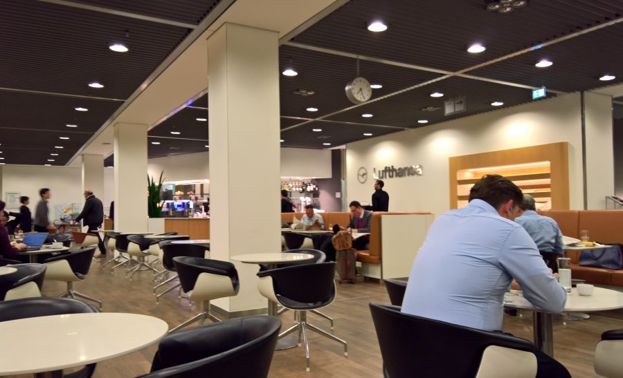 Mittemot vår gate fanns en Senator lounge där jag frågade om vi kunde komma in alla tre. Enligt vakten vid ingången var 1 gold + 1 gäst + 1 barn <2 år ok. Så hissen upp och mamma och barn kunde låna ett vilorum att amma i. Personalen gav oss en Lufthansa-stork :) Vi utforskade inte loungen speciellt, men den hade en mysig del med bar och lite fåtöljer som jag gärna provat (utan bebis). Vi satt med lite uppsikt över maten.